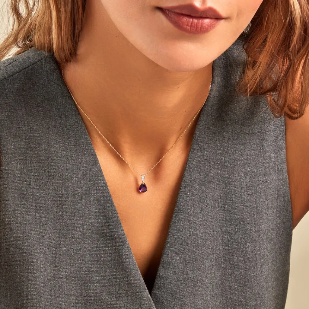 Pendentif Or Jaune 375/1000 Poire Amethyste Violet 1.3 Cts Serti 3 Griffes