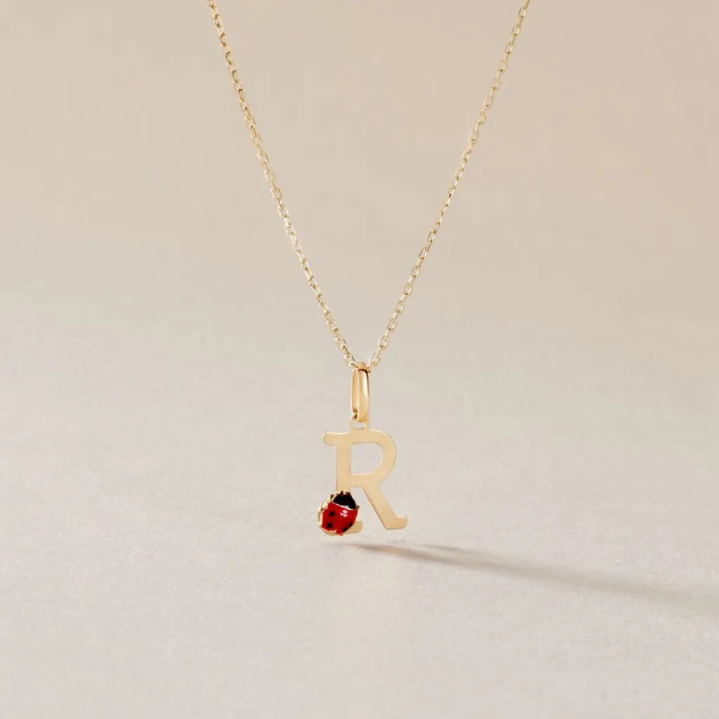 Pendentif Or Jaune 375/1000 Lettre R Motif Coccinelle Email Noir Et Rouge