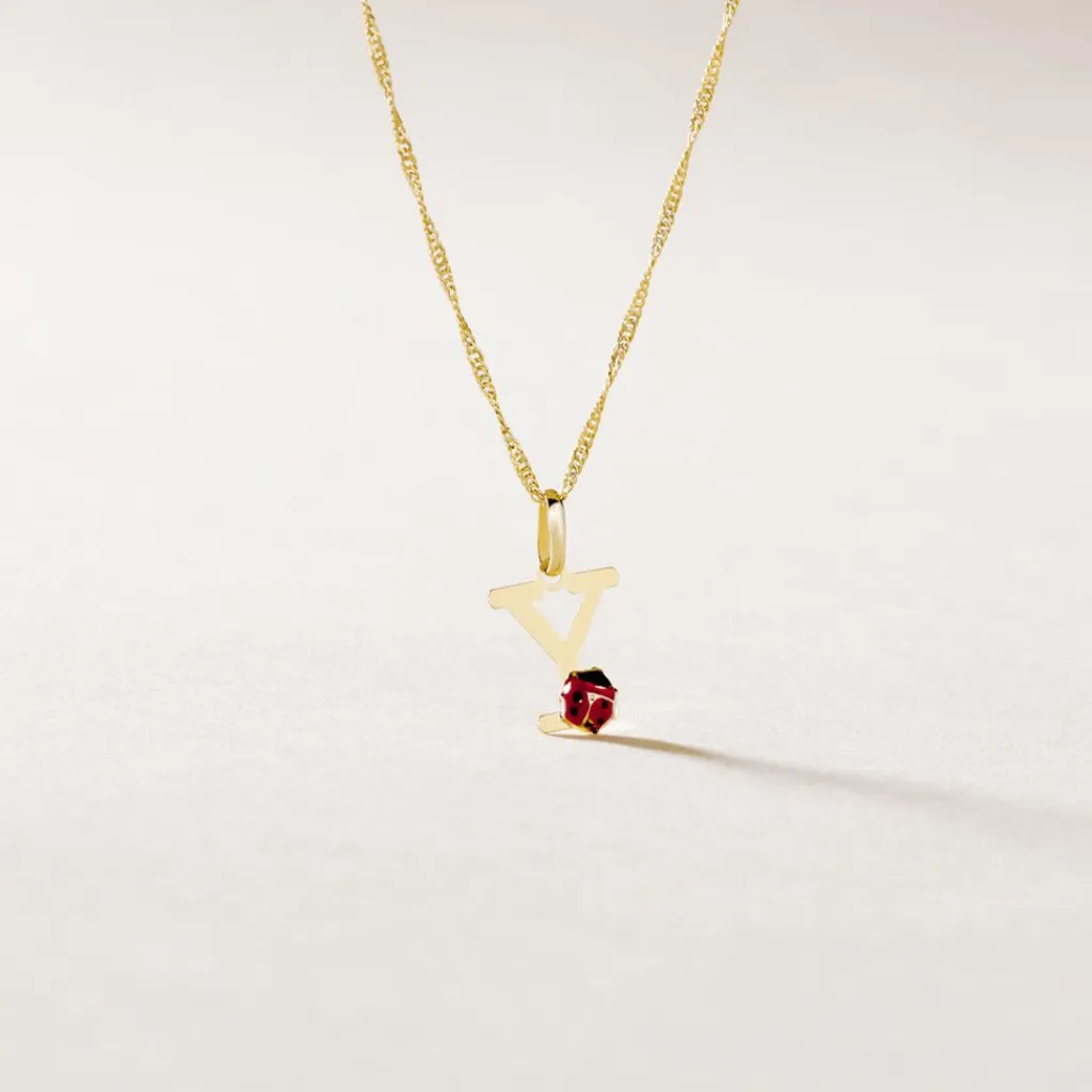 Pendentif Or Jaune 375/1000 Lettre Y Motif Coccinelle Email Noir Et Rouge