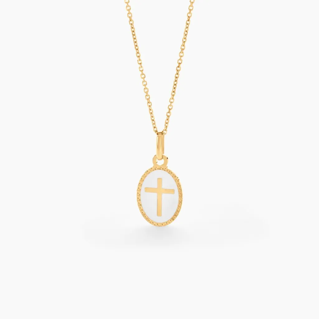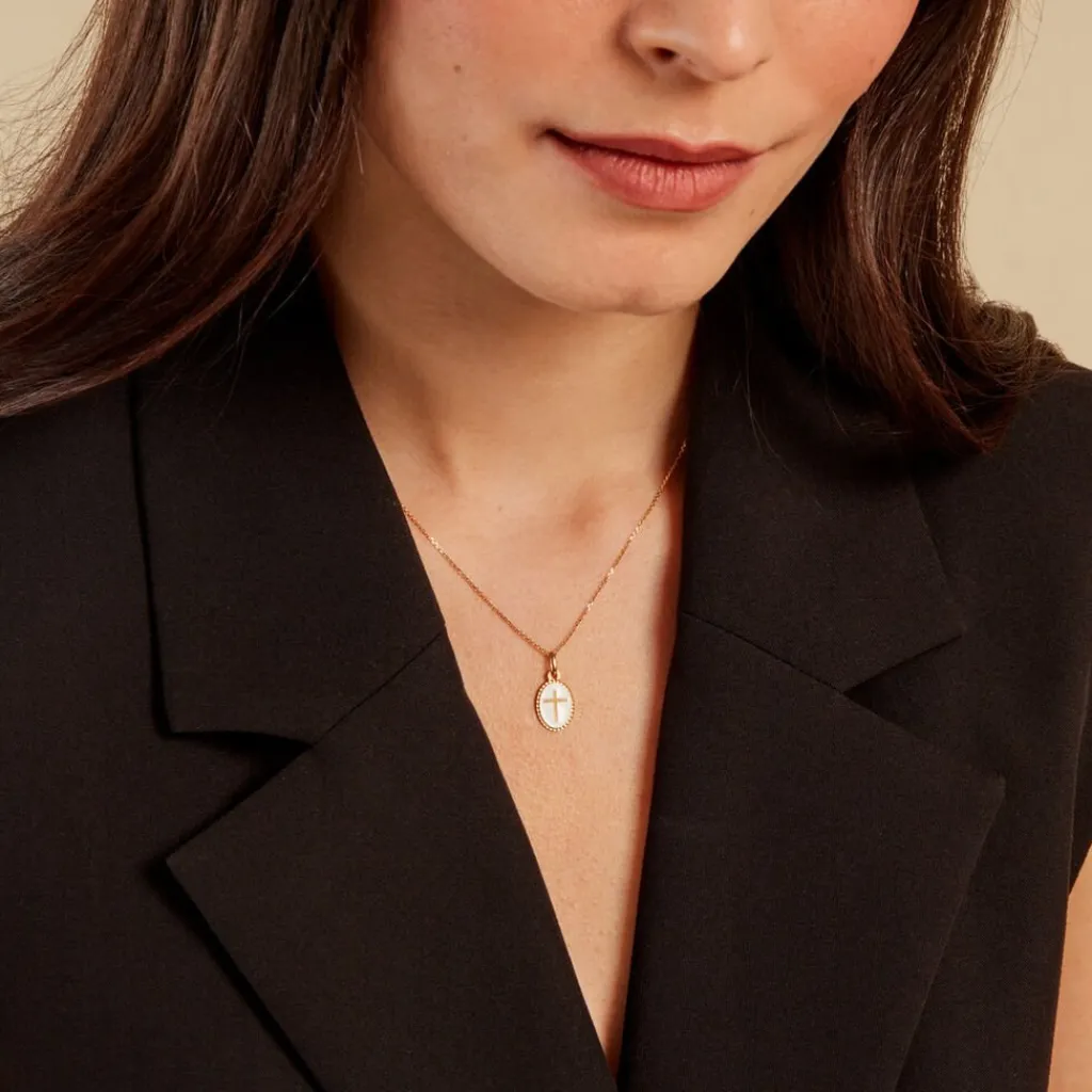 Pendentif Or Jaune 375/1000 Croix Pastille Ovale Effet Perle Email Blanc 1.4cm