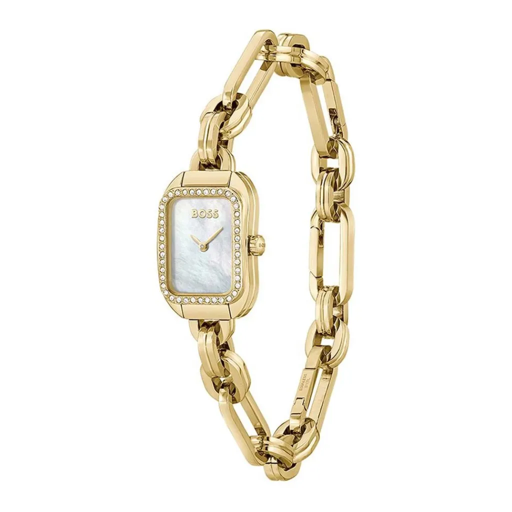 Montre Boss Hailey Acier Dore Rectangulaire Quartz 19mmx28mm Fond Nacre Bracelet Acier Dore Fantaisie 1502740