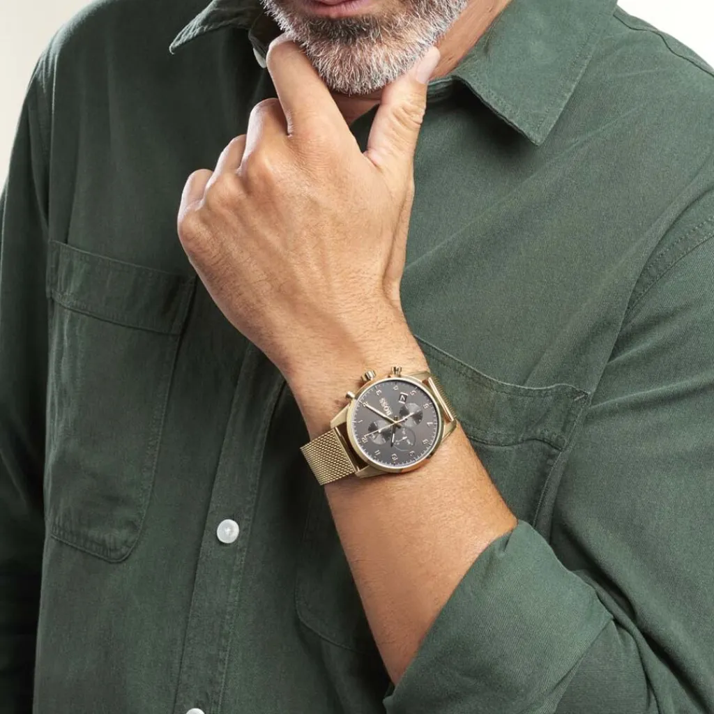 Montre Boss Skymaster Acier Dore Ronde Quartz Chronographe 44mm Fond Noir Bracelet Acier Dore 1513838