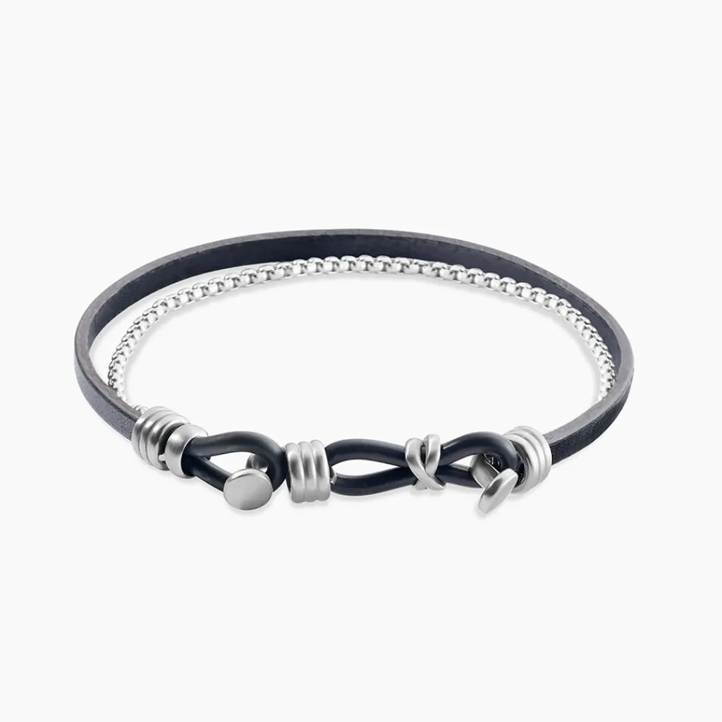 Bracelet Jourdan Arpad Acier Inoxydable Argente Et Cuir Noir 20cm+1cm Jh150201b