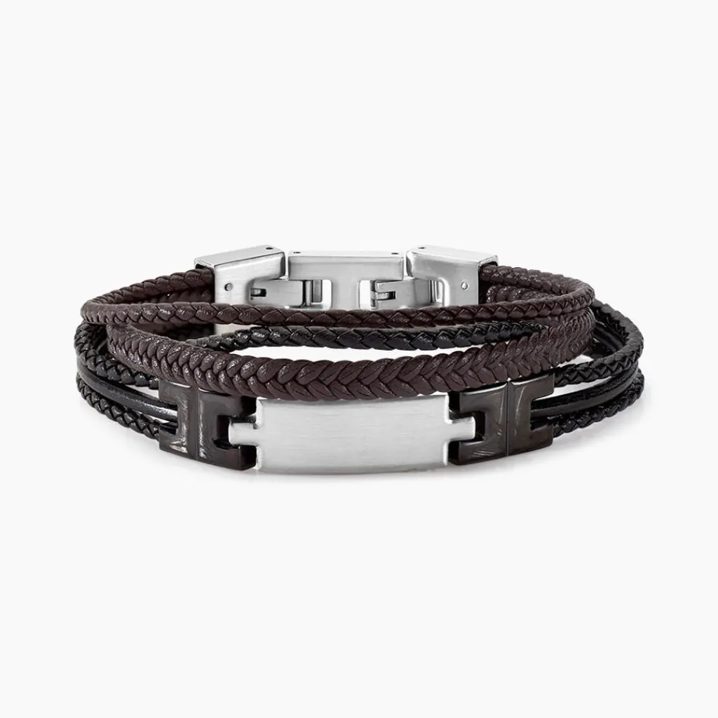Bracelet Jourdan Thasos Multi Rang Cuir Noir Et Marron Acier Blanc Et Noir 21cm Jh110032b