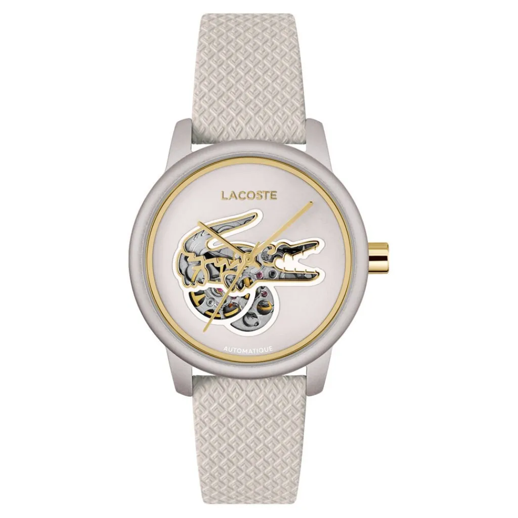 Montre Lacoste.12.12 Automatique Aluminium Blanc Automatique Ronde 38Mm Fond Argenté Motif Crocodile C艙ur Ouvert Bracelet Cuir De Veau Blanc 2001467