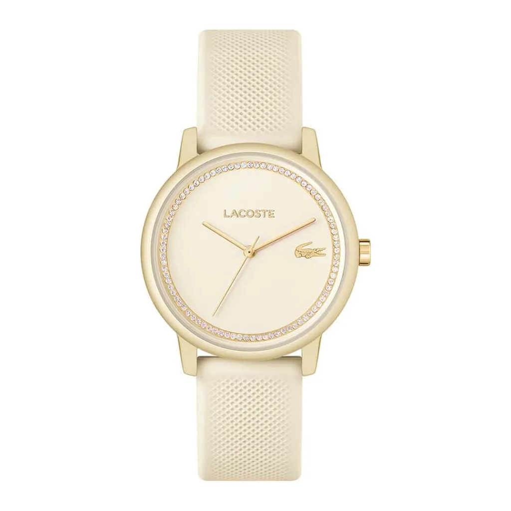 Montre Lacoste 12.12 Go Aluminium Champagne Ronde Quartz 36mm Lunette Strass Fond Doré Bracelet Silicone Champagne 2001288
