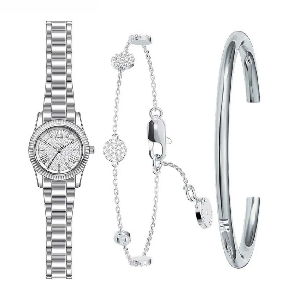 Coffret Montre Michael Kors Micro Lexington Acier Inoxydable Argenté Quartz Ronde 19Mm Fond Argenté Et Strass Bracelet Acier Inoxydable Argenté + Bracelet Maillon Argente + Jonc Mickael Kors Argente Mk4948Set