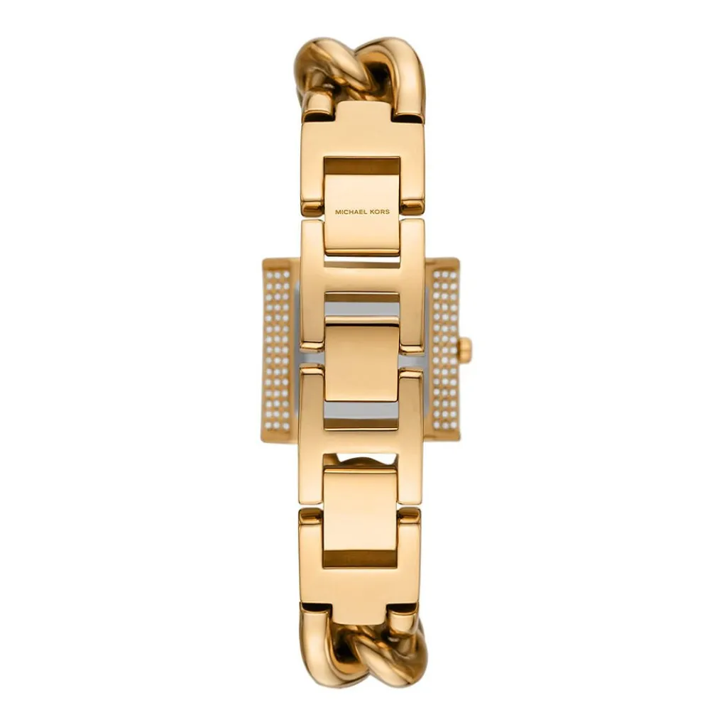 Montre Michael Kors Chain Lock Acier Dore Carre Quartz 25mm Lunette Strassee Fond Dore Bracelet Acier Dore Mk4711