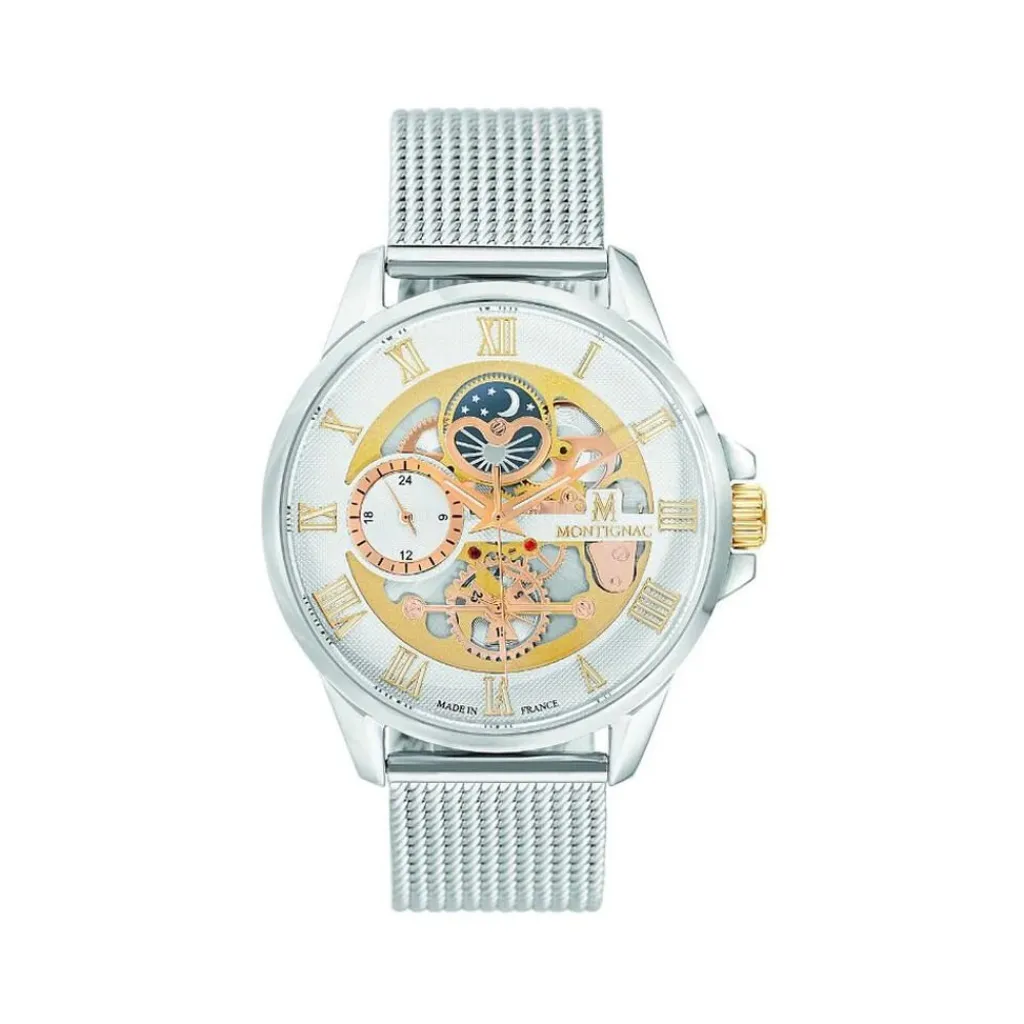 Montre Montignac Round Acier Argente Ronde Quartz 42mm Fond Argente Bracelet Acier Argente Milanais Mow610