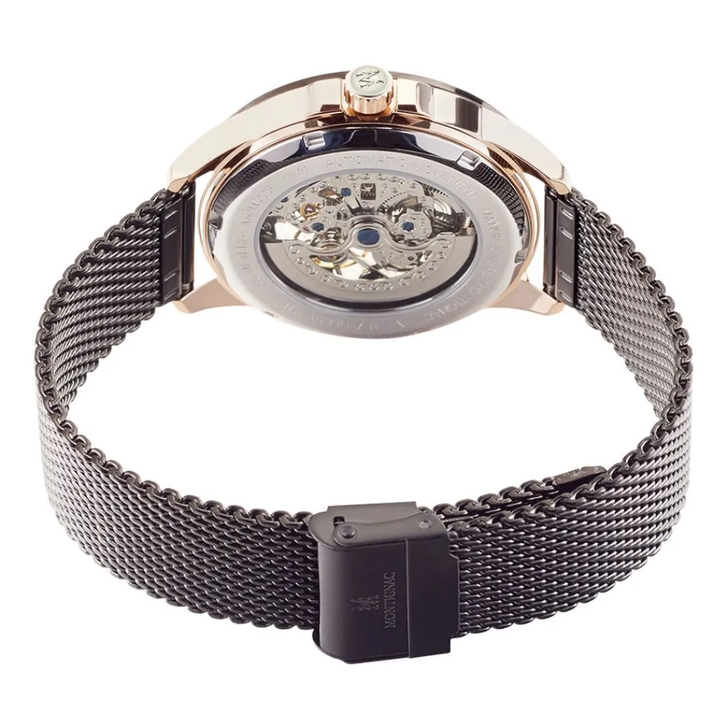 Montre Montignac Round Automatique Acier Dore Rose Ronde Automatique 42mm Fond Noir Bracelet Acier Noir Mow006