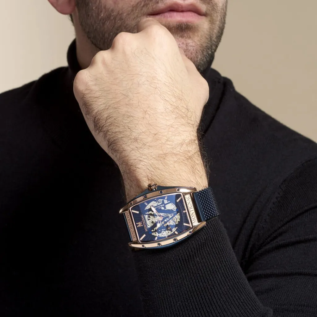 Montre Montignac Tonneau Automatique Acier Noir Tonneau Auto 59*45mm Fond Bleu Bracelet Acier Milanais Bleu Mow706