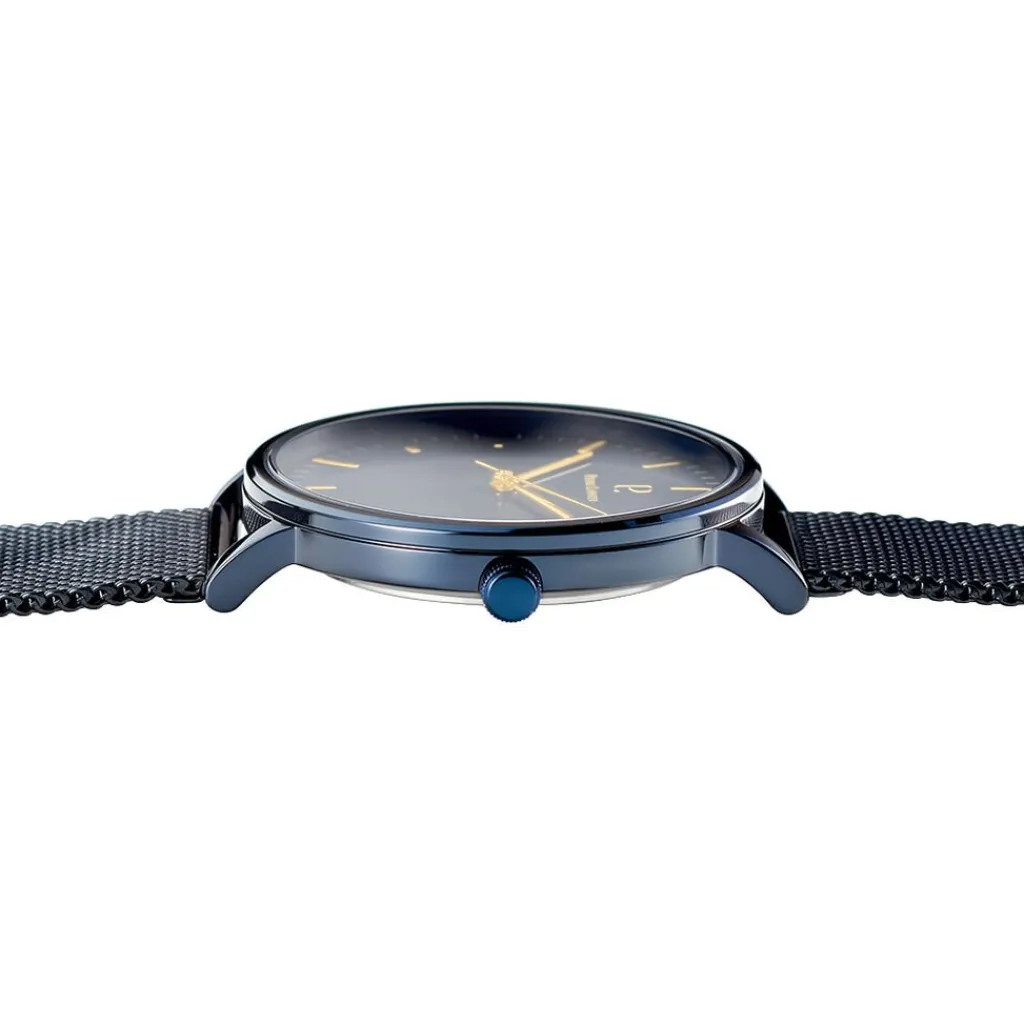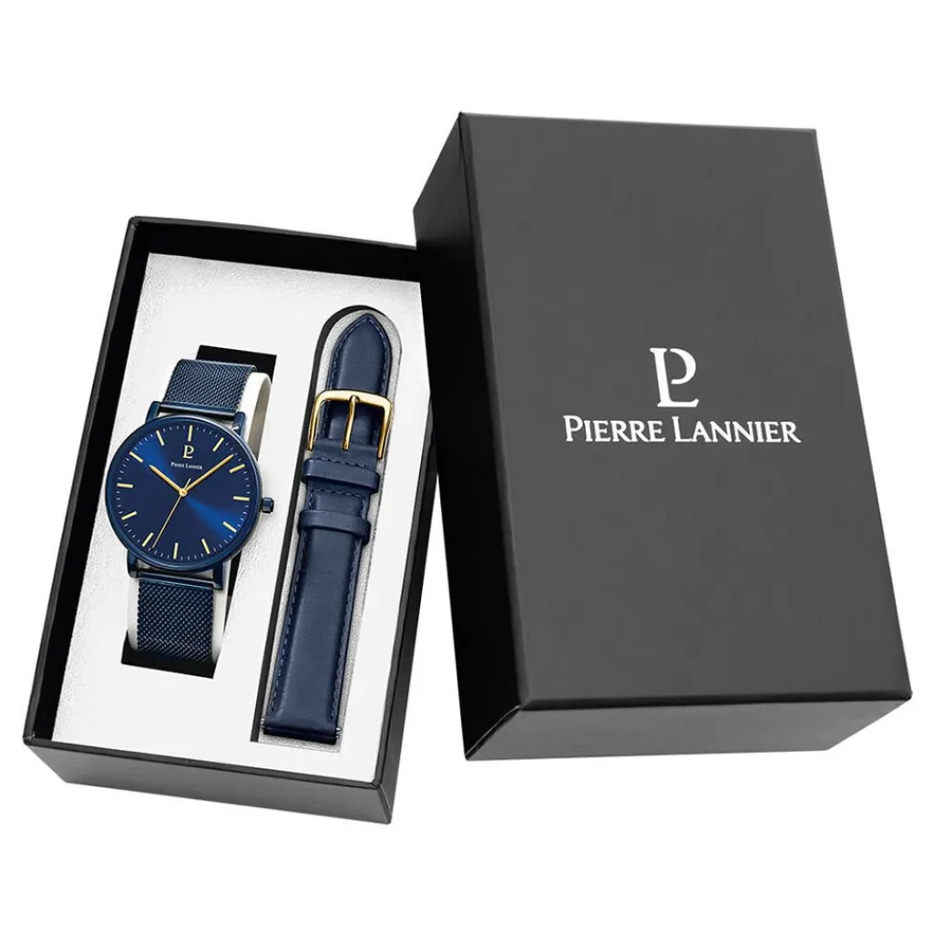 Coffret De Montre Pierre Lannier Essential Acier Bleu Rond Quartz 40.5mm Fond Bleu Bracelet Acier Milanais Bleu + Bracelet Cuir Bleu 388c466