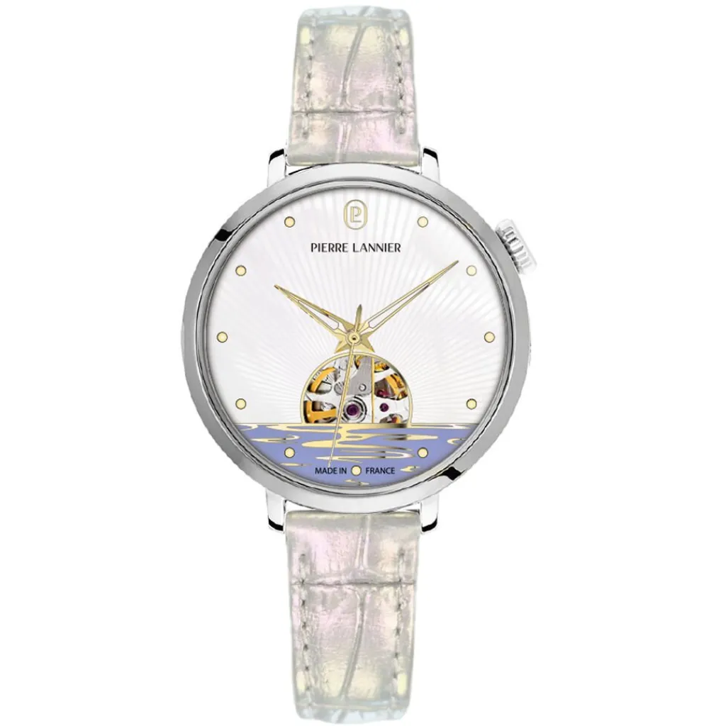 Montre Pierre Lannier Australe Acier Inoxydable Argenté Automatique Ronde 35Mm Fond Nacre Coucher De Soleil Coeur Ouvert Bracelet Cuir De Veau Blanc Nacré 150H900