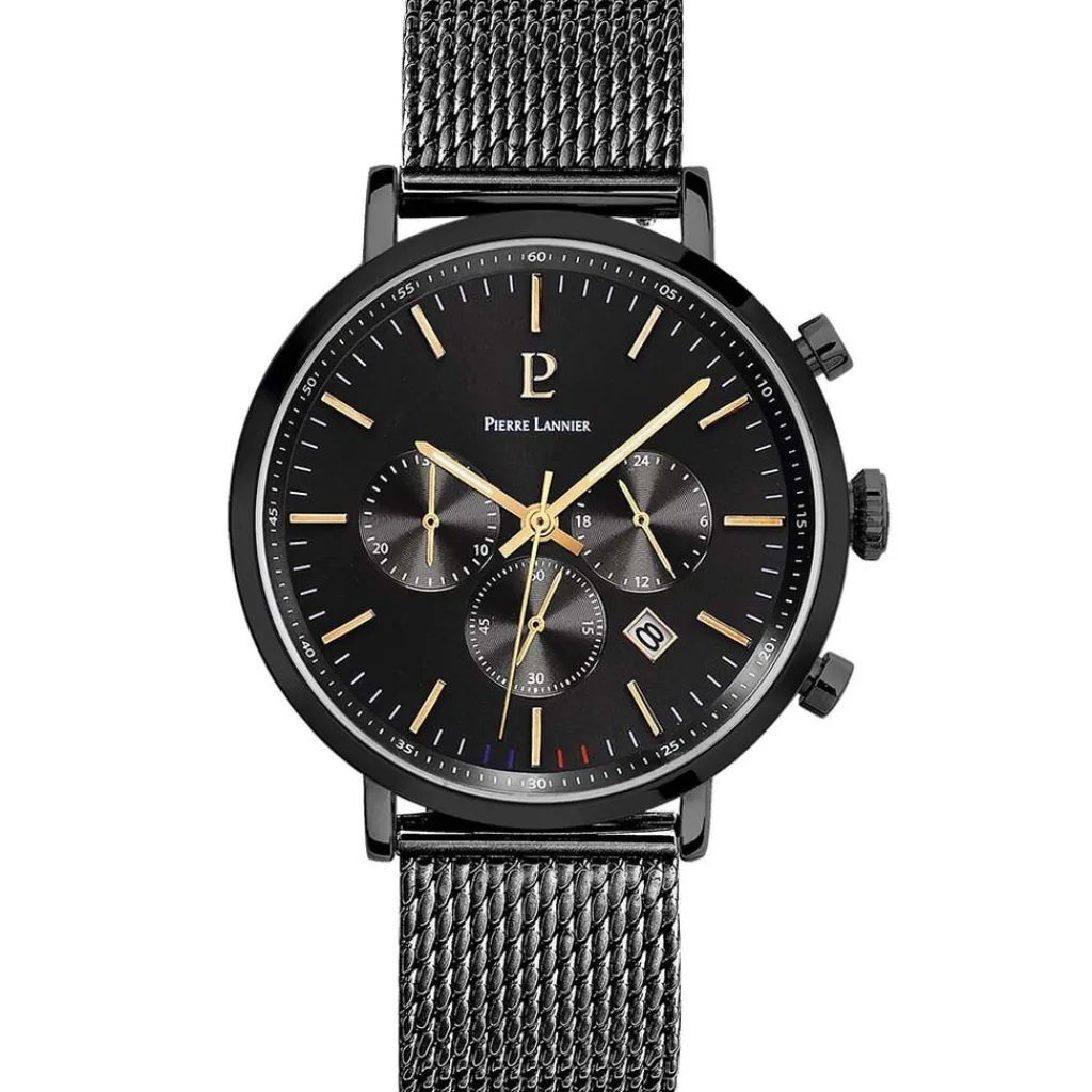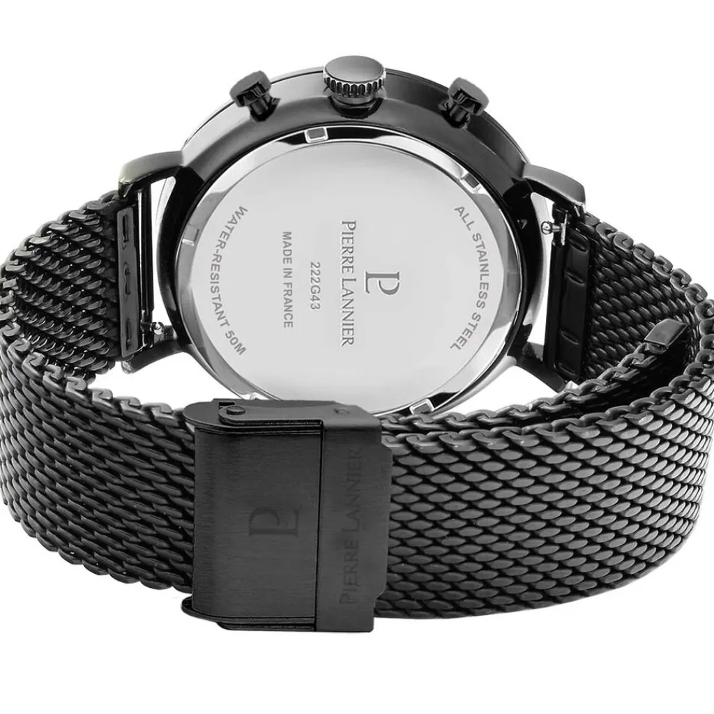 Montre Pierre Lannier Baron Acier Noir Ronde Quartz Multifonction 43mm Fond Noir Bracelet Acier Noir Maille Milanaise 222g439