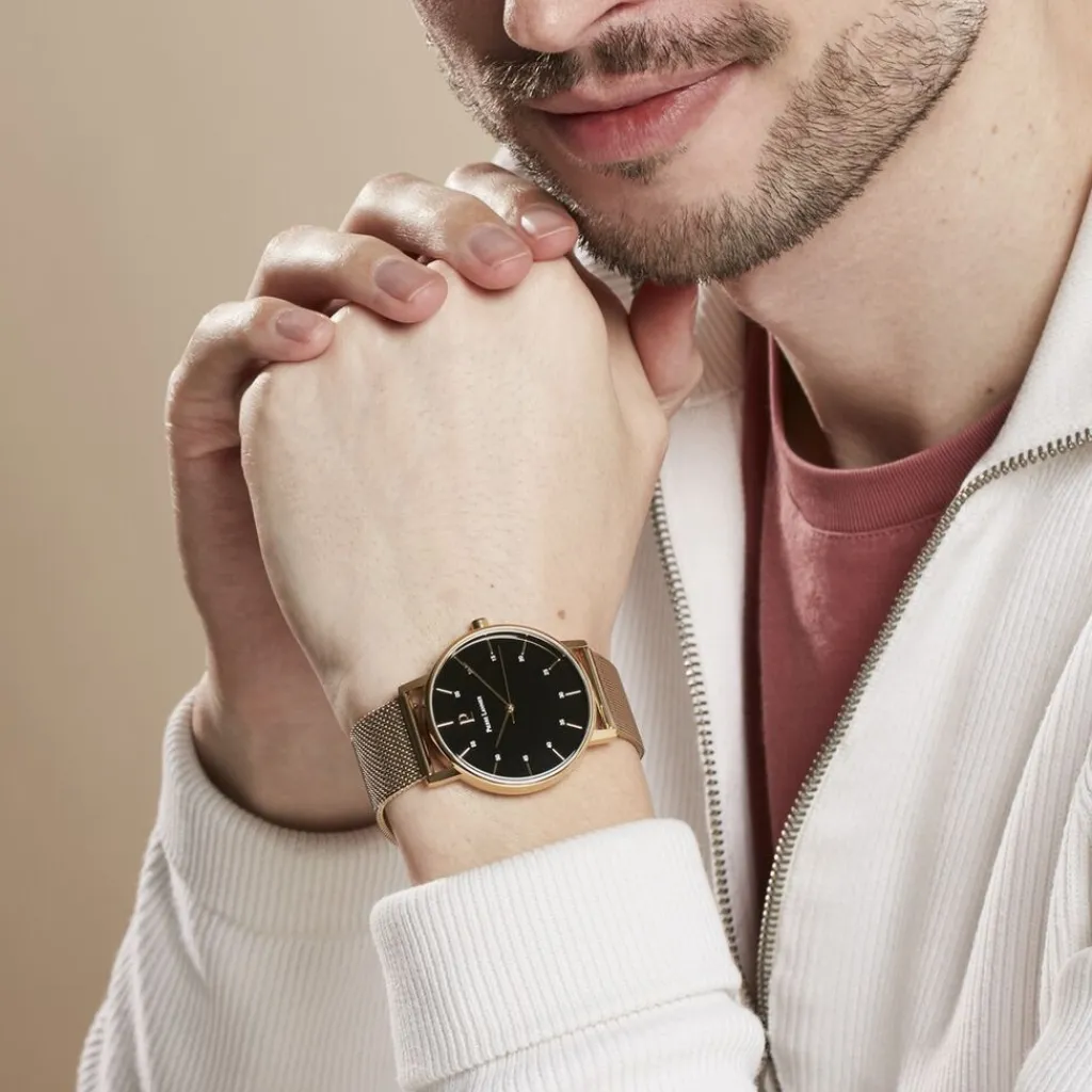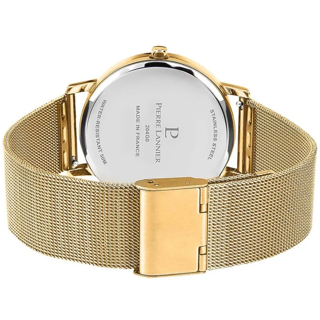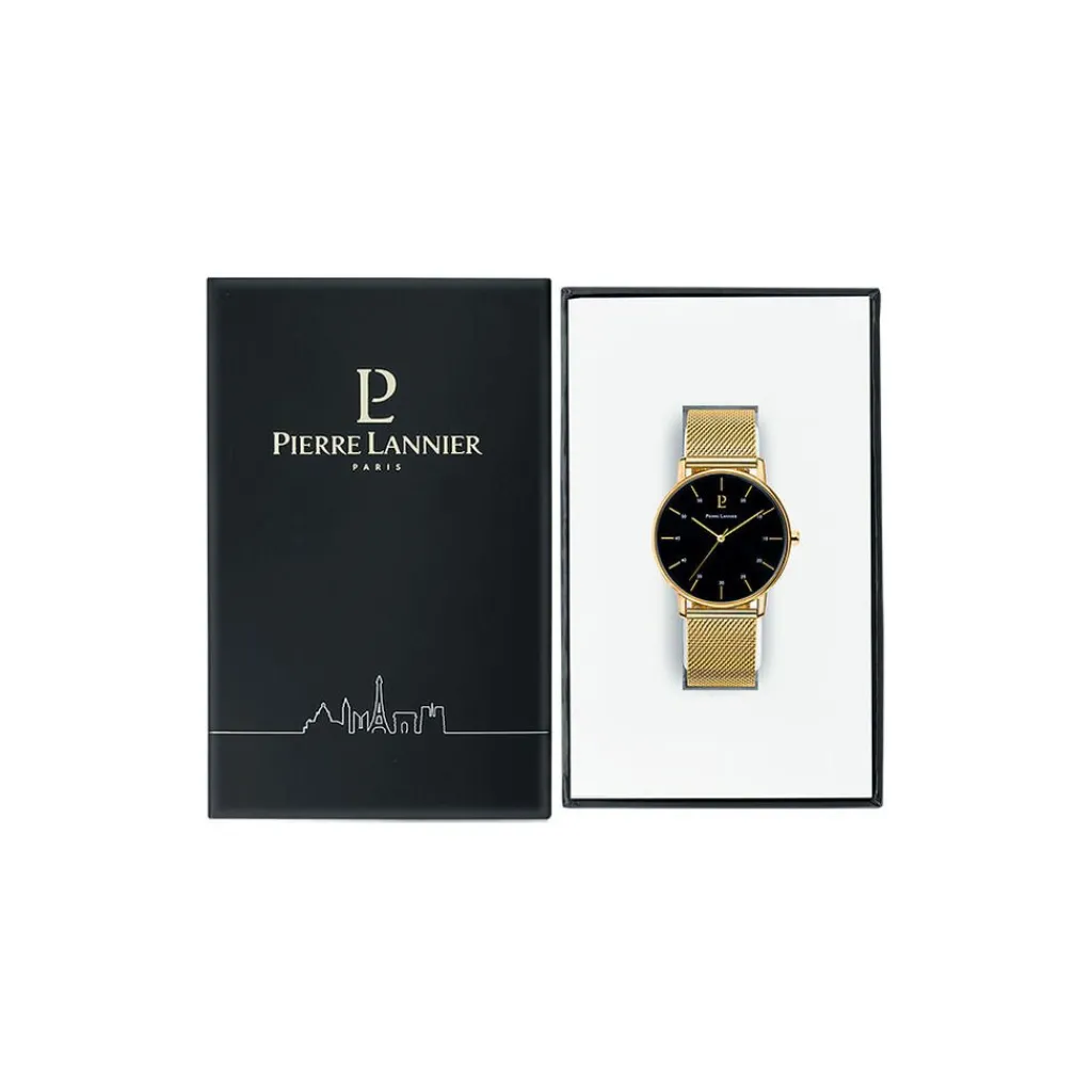 Montre Pierre Lannier Cityline Acier Doré Ronde Quartz 39mm Fond Noir Bracelet Acier Maille Milanaise Doré 200g032