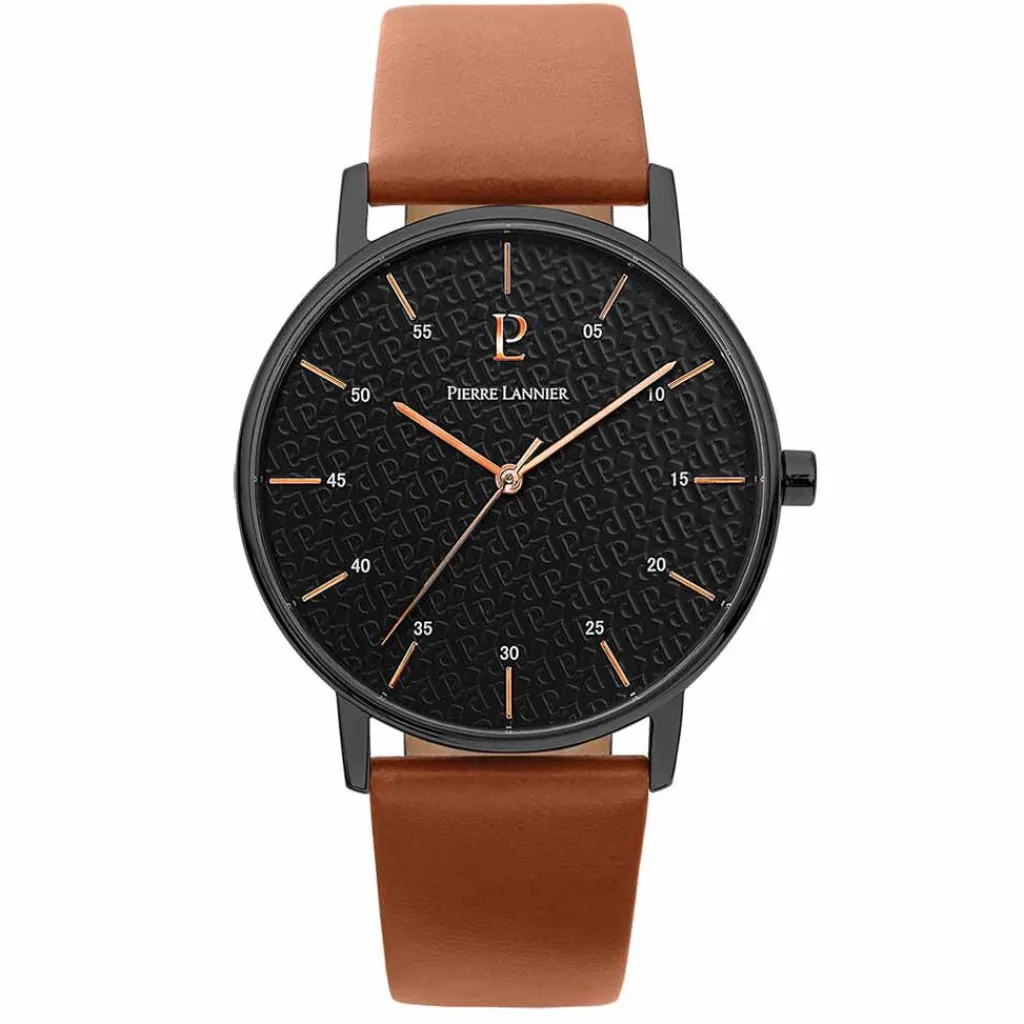 Montre Pierre Lannier Collection Cityline Acier Noir Ronde Quartz 39mm Fond Noir Bracelet Cuir Brun 203f434