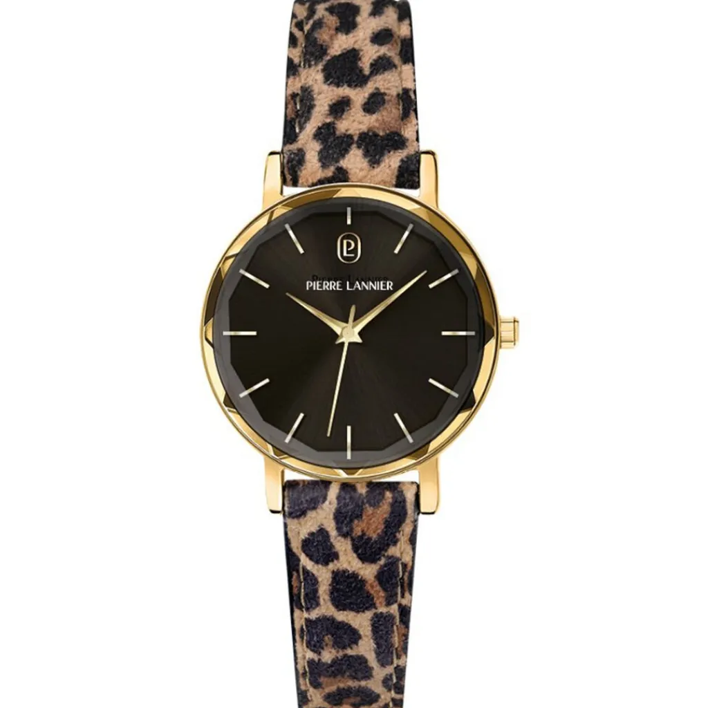 Montre Pierre Lannier Multiples Acier Inoxydable Doré Quartz Ronde 30Mm Fond Noir Bracelet Cuir De Veau Imprimé Leopard 010P539