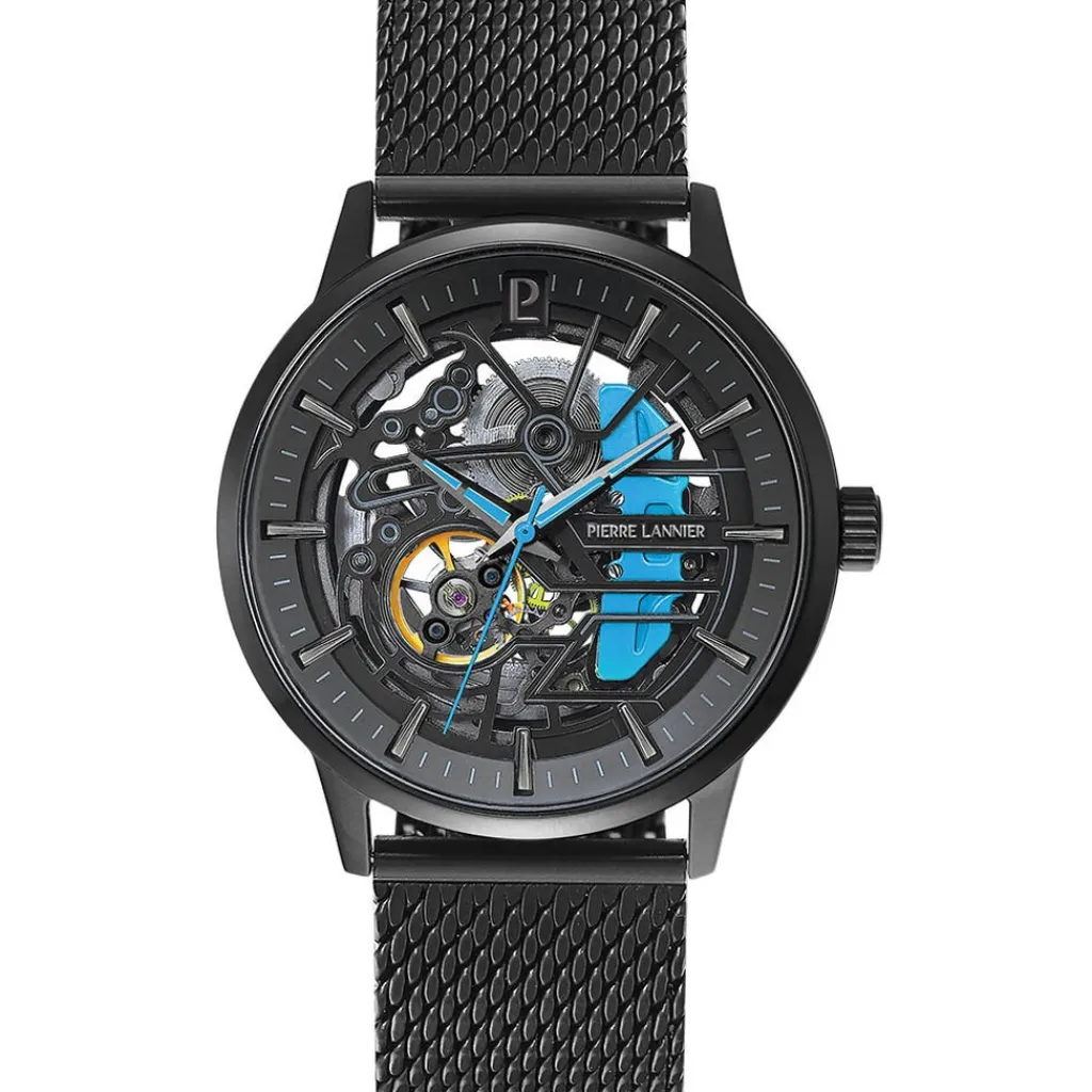 Montre Pierre Lannier Paddock Acier Noir Ronde Automatique 43mm Fond Noir Et Bleu Bracelet Acier Noir Milanais 345a469