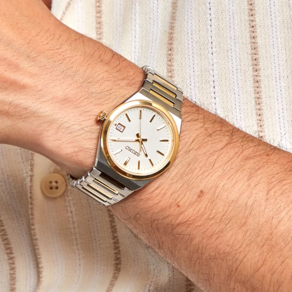 Montre Seiko Classique Acier Argenté Ronde Quartz 38.5mm Fond Blanc Bracelet Acier Bicolore 10atm Sur558p1