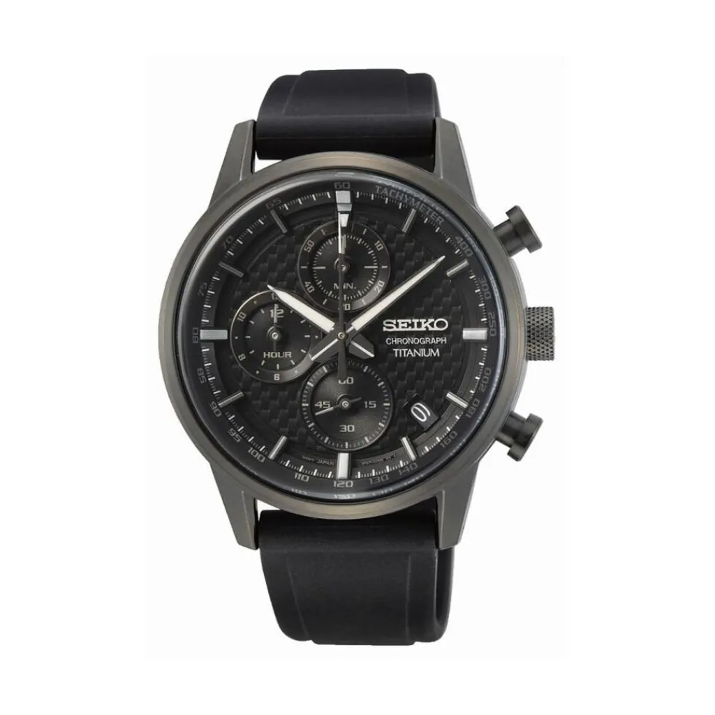 Montre Seiko Sport Titane Gris Ronde Quartz Chronographe 41.6mm Fond Noir Bracelet Silicone Noir Ssb393p1