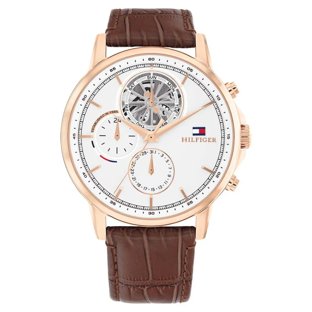 Montre Tommy Hilfiger Stewart Acier Rose Ronde Quartz Multifonctions 44mm Fond Blanc Bracelet Cuir De Veau Marron 1710606