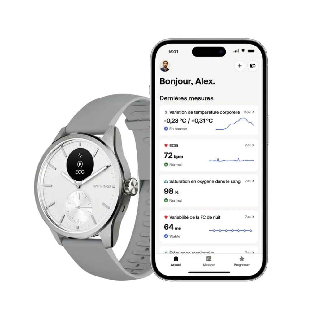 Montre Withings Scanwatch 2 Acier Inoxydable Argente Ronde Connectee 42mm Fond Blanc Bracelet Silicone Gris Wsw242white