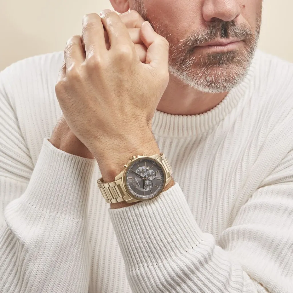 Montre Armani Exchange Acier Doré Ronde Chrono Fond Gris Bracelet Acier Doré