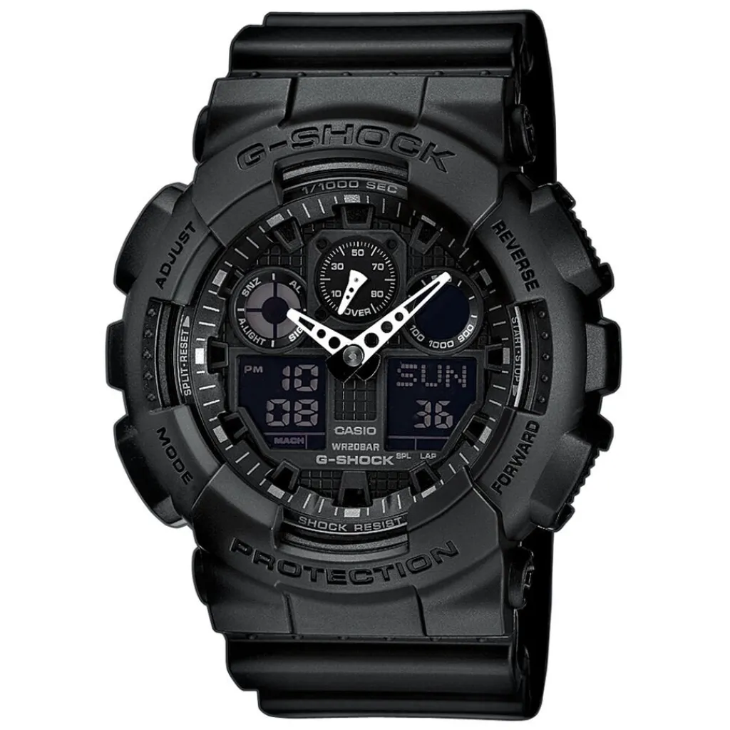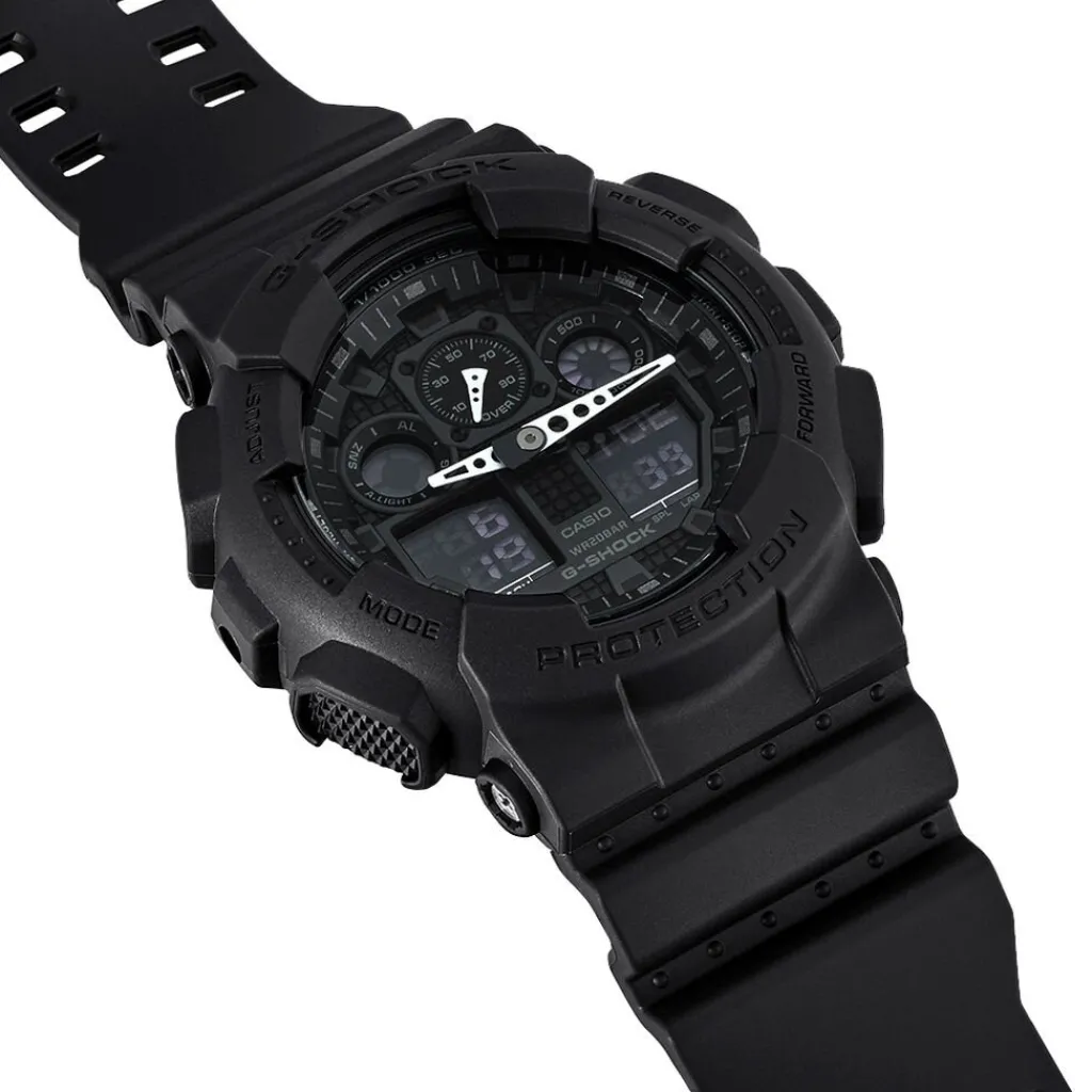 Montre Casio G-shock Black & White Acier Noir Ronde Quartz Chronographe 51mm Fond Noir Et Index Noir Bracelet Resine Noire Ga-100-1a1er