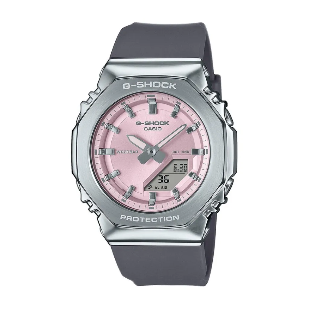 Montre Casio G-shock Anadigit Acier Argente Ronde Quartz Multifonctions 40.50mm Fond Rose Bracelet Resine Noir Gm-s2110-4aer