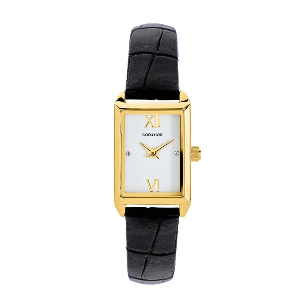 Montre Codhor Suzy Alliage Doré Rectangulaire Quartz 17.5×28.5mm Fond Blanc Bracelet Synthetique Effet Alligator Noir P101073-g