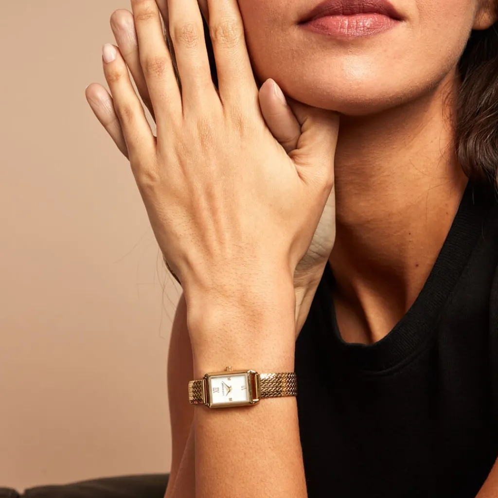 Montre Codhor Suzy Alliage Doré Rectangulaire Quartz 17.5×28.5mm Fond Blanc Bracelet Milanais Acier Doré P101073-b