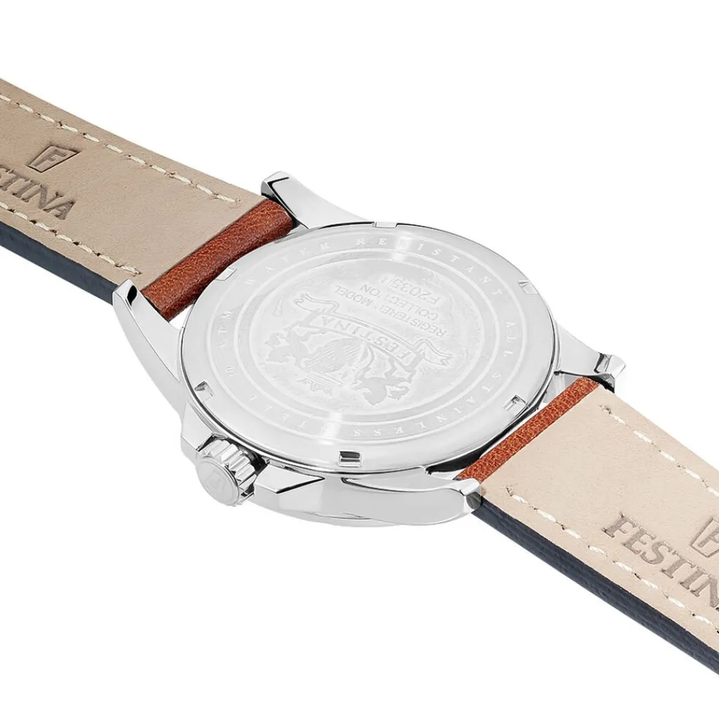 Montre Festina Classics Acier Blanc Ronde Quartz 41mm Fond Noir Bracelet Cuir Marron F203582