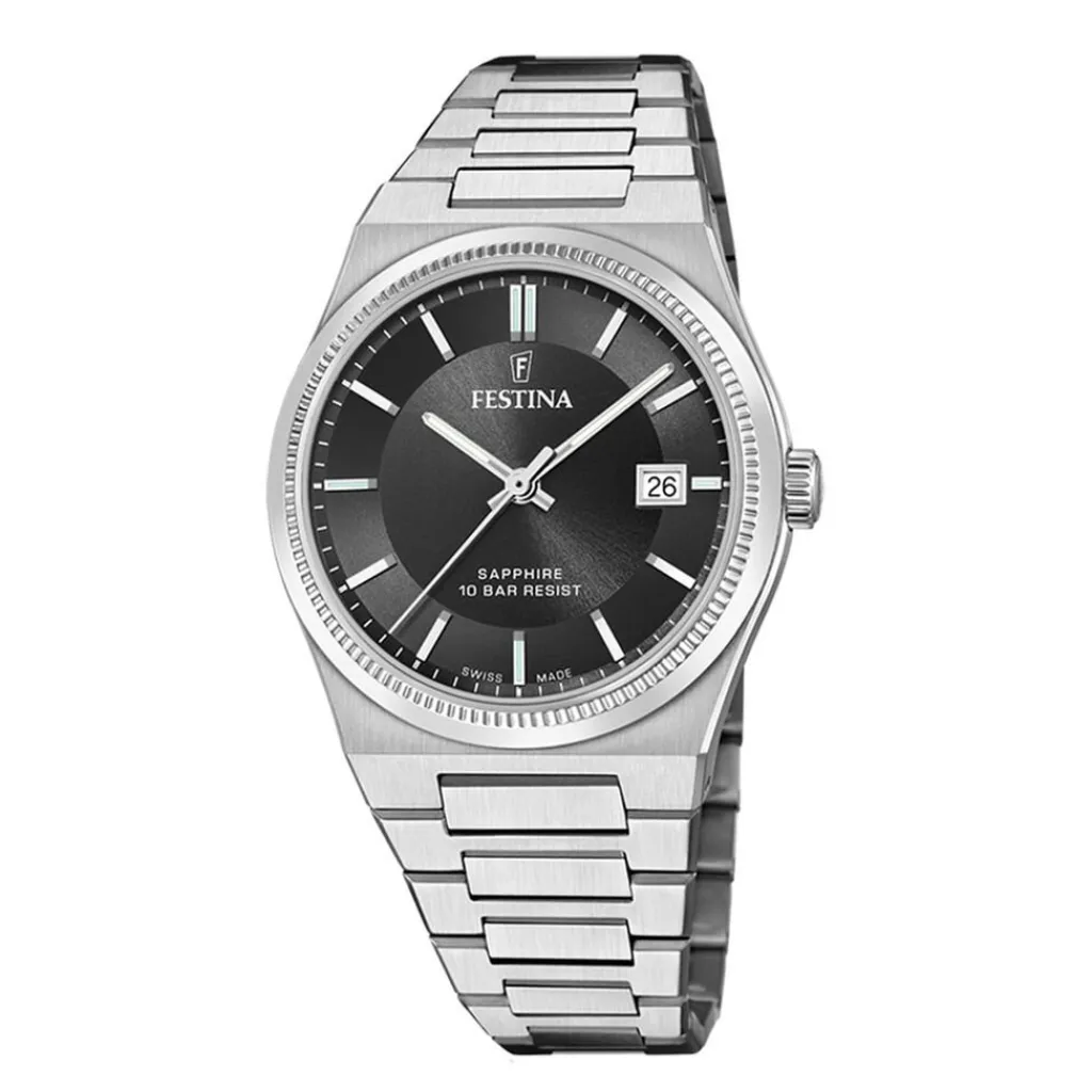 Montre Festina Swiss Made Acier Argente Ronde Quartz 40mm Lunette Ciselee Fond Noir Bracelet Acier Argente F20034/4