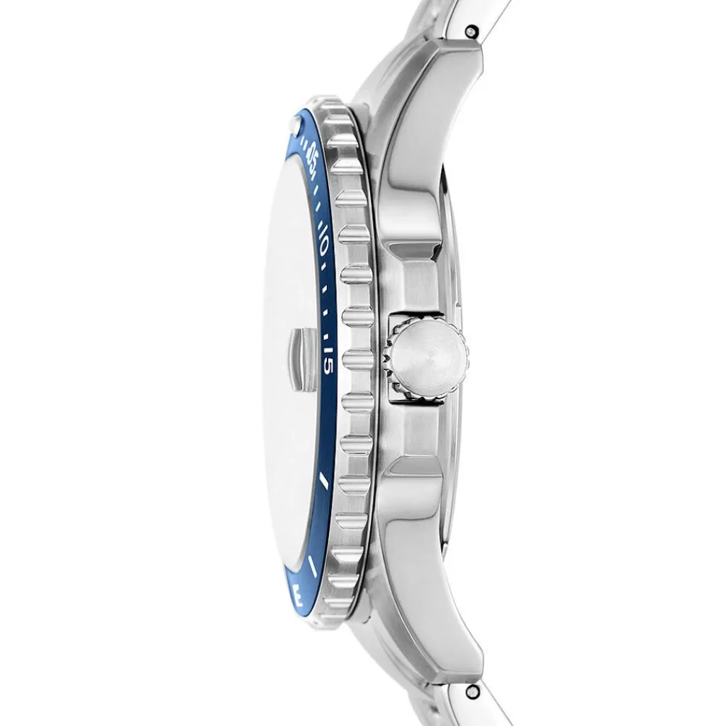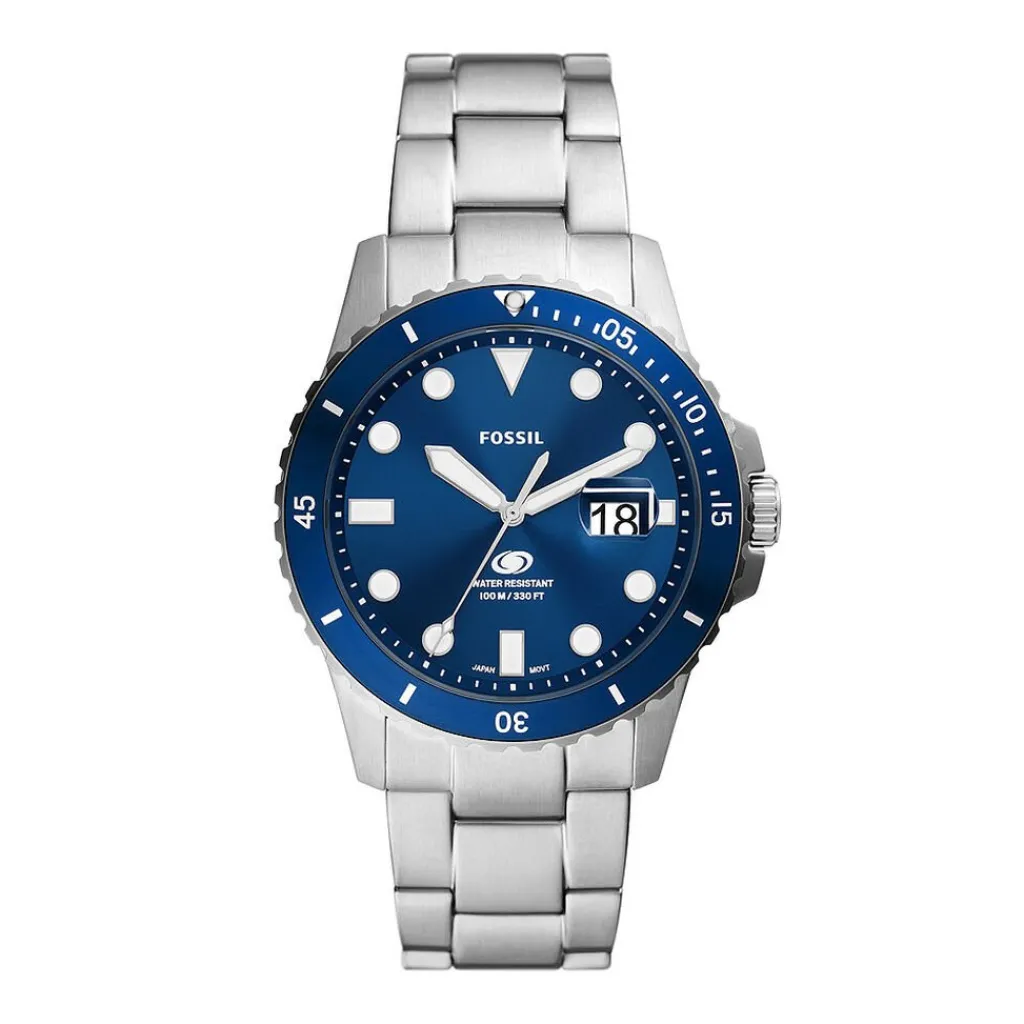 Montre Fossil Blue Dive Acier Argenté Ronde Quartz 42mm Fond Bleu Lunette Bleue Bracelet Acier Argenté Fs6029