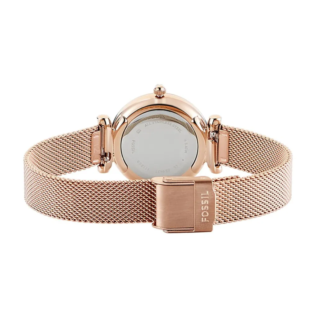 Montre Fossil Carlie Mini Acier Dore Ronde Quartz 28mm Fond Nacre Blanc Bracelet Acier Rose Es4433