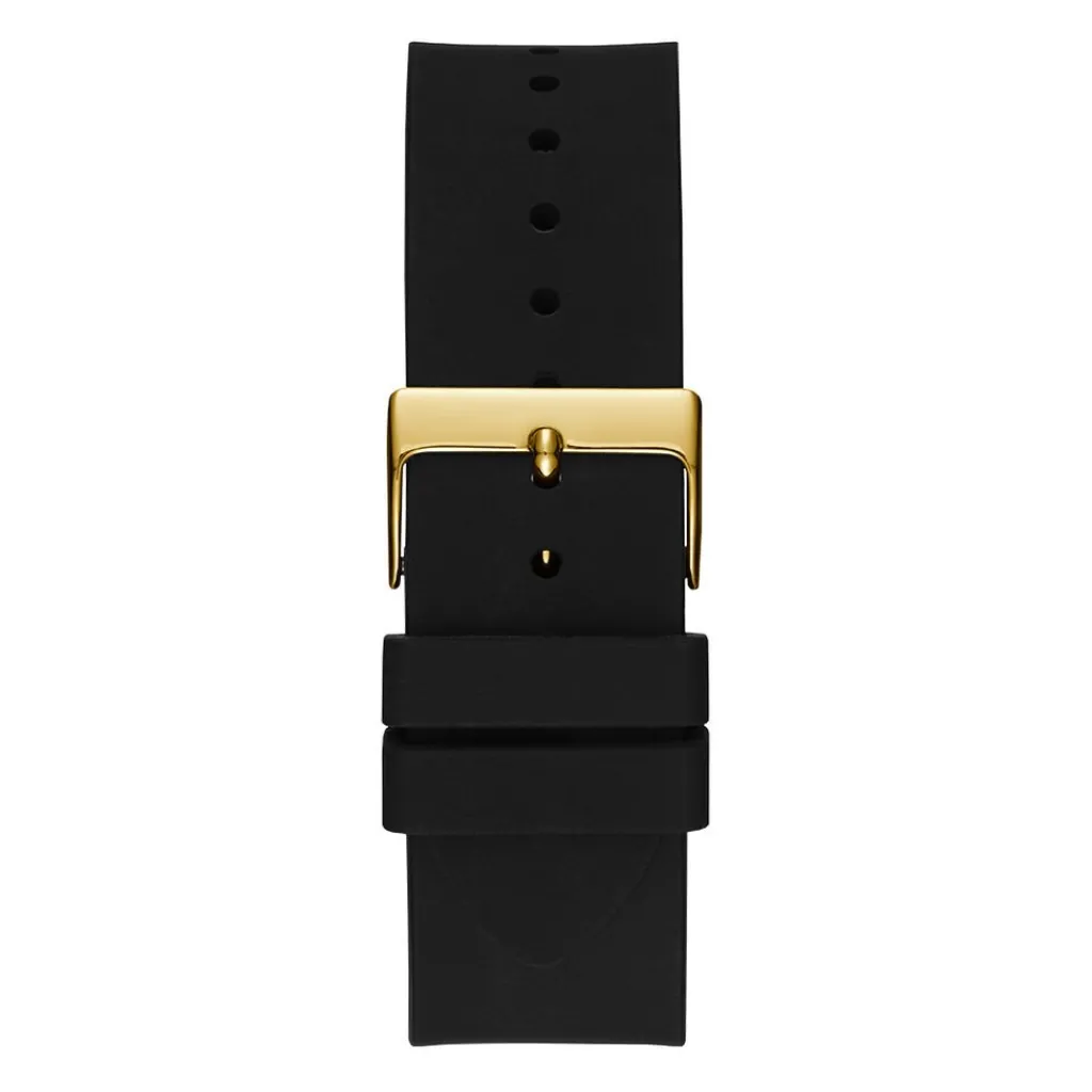 Montre Guess Frontier Acier Dore Ronde Quartz 48mm Fond Noir Bracelet Silicone Noir W1132g1