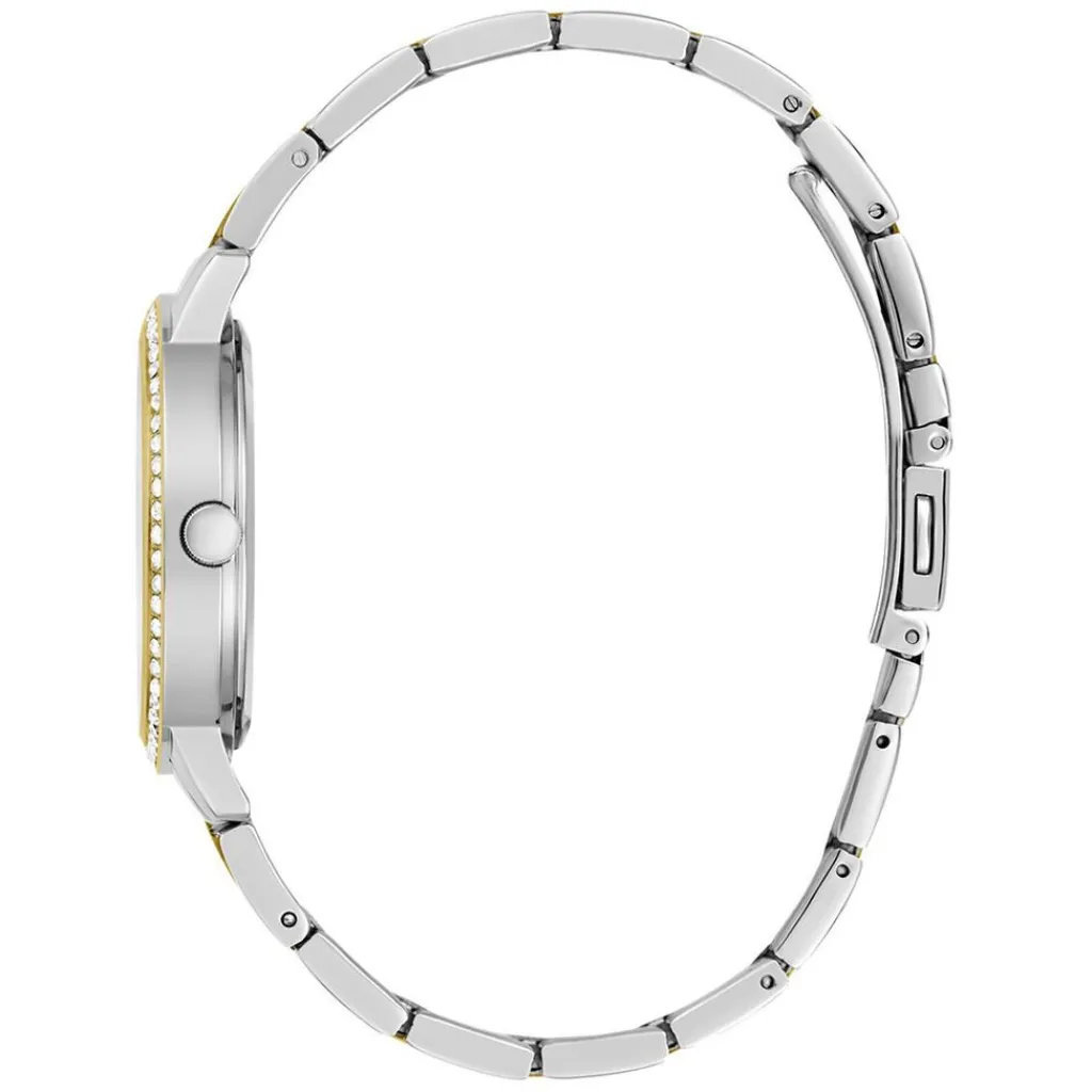 Montre Guess Heartless Acier Bicolore Doré Blanc Ronde Quartz 34mm Lunette Strassée Fond Argenté Bracelet Acier Bicolore Doré Blanc Gw0725l1