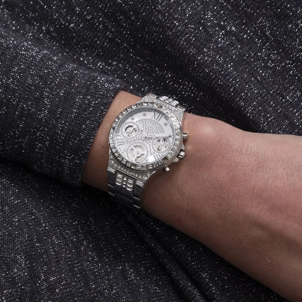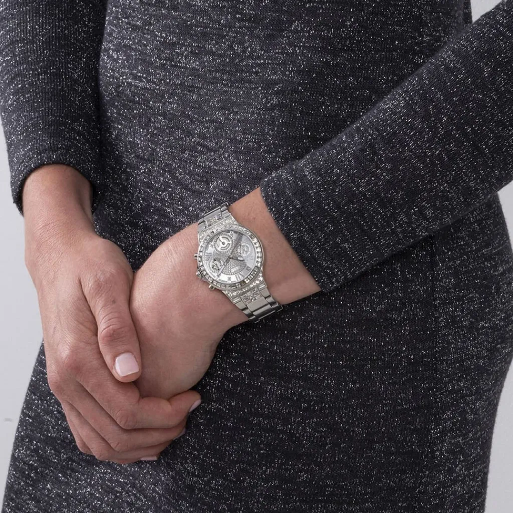 Montre Guess Moonlight Acier Argenté Rond Quartz Multifonction 36mm Fond Argenté Lunette Strass Bracelet Acier Argenté Gw0320l1