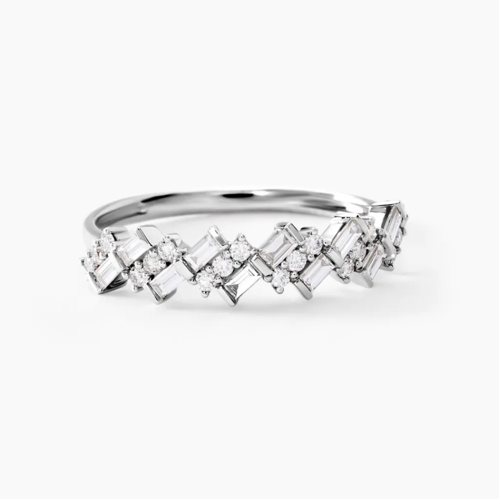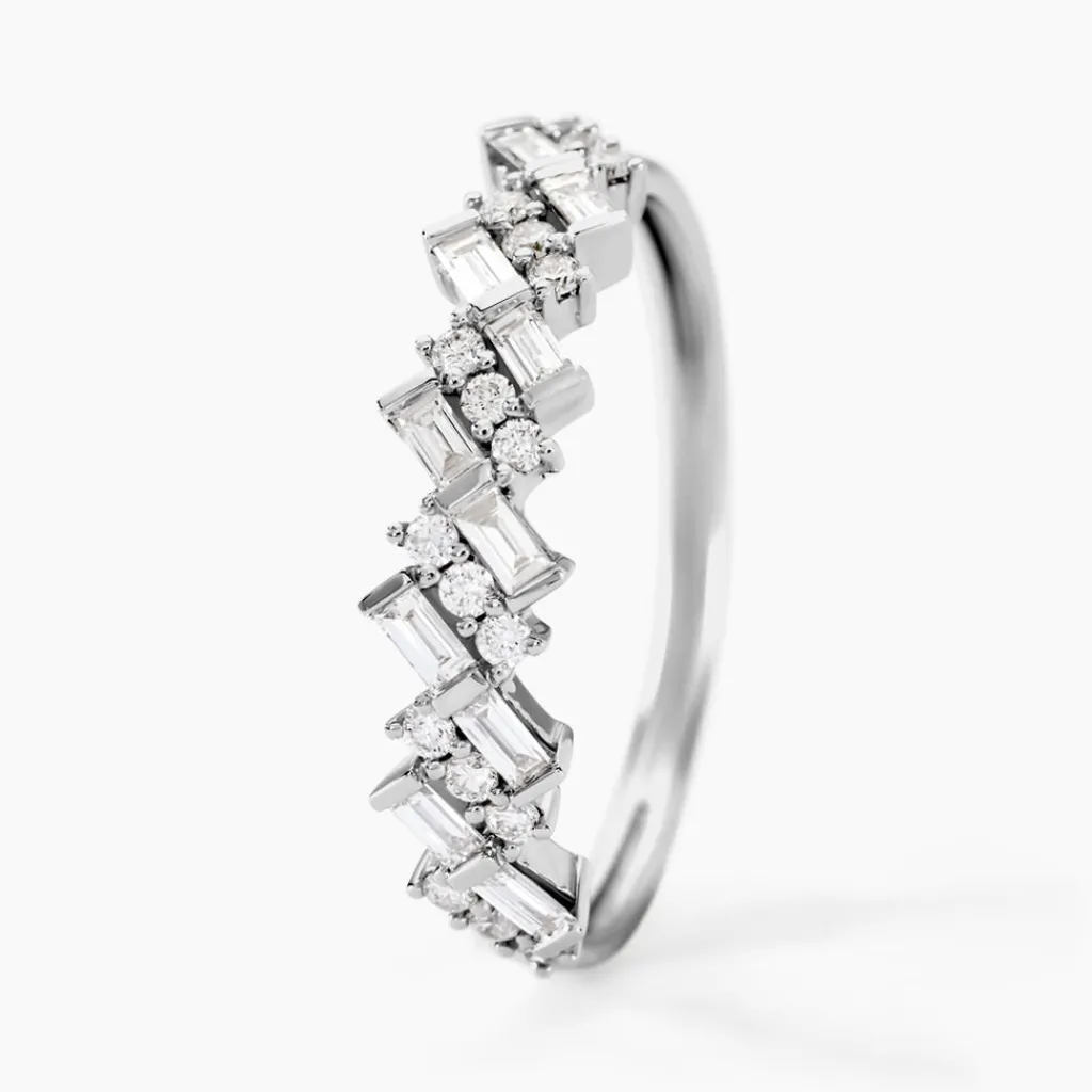 Bague Or Blanc 375/1000 Jardin De Pierres Diamants Synthetiques Baguettes 0.22cts Sertis Griffes