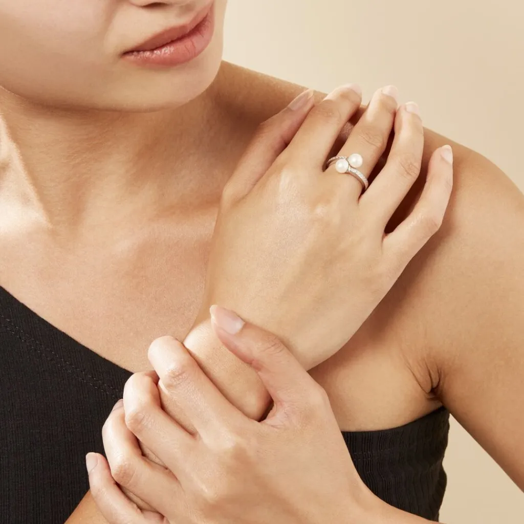 Bague Ajustable Argent Blanc 925/1000 Double Perle De Culture 6-6.5 Pavage Oxydes De Zirconium
