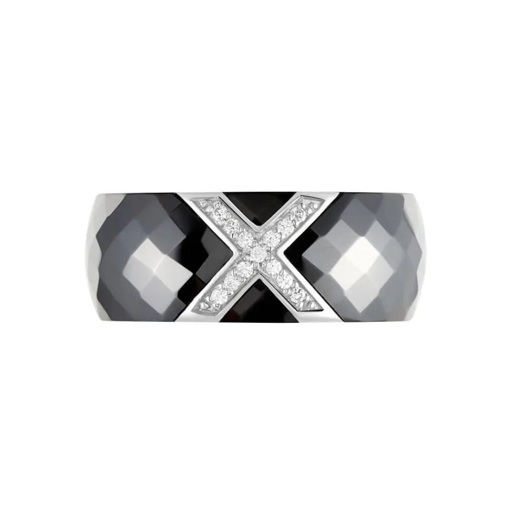 Bague Argent Blanc 925/1000 Ceramique Noire Forme X Oxydes De Zirconium