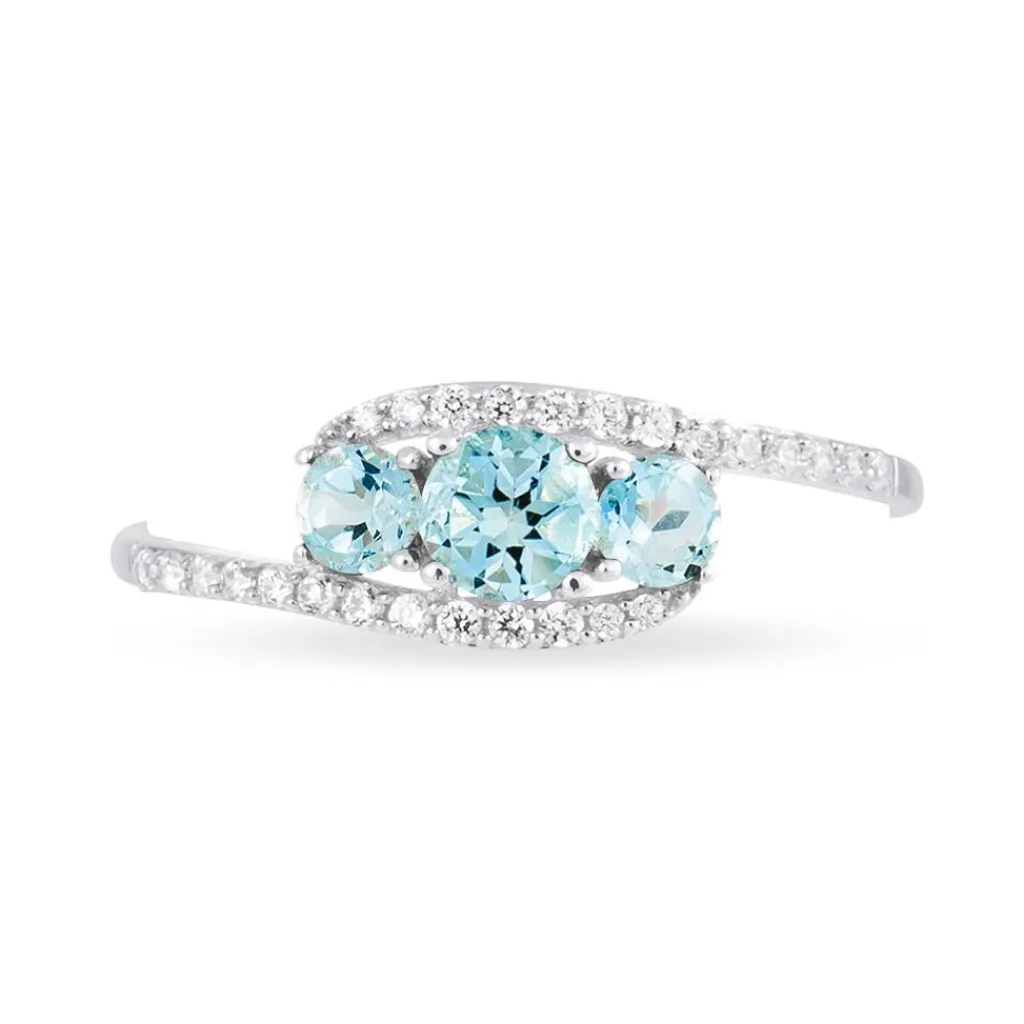 Bague Or Blanc 375/1000 Trilogie Topazes Bleus 0.57ct Sertis 4 Griffes Et Oxydes De Zirconium