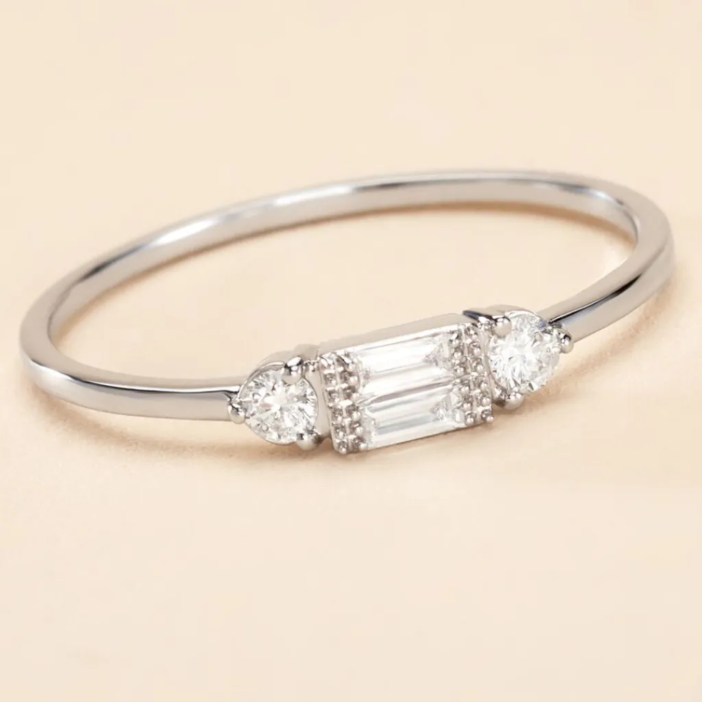 Bague Or Blanc 375/1000 2 Diamants Taille Baguette Accompagnes De 2 Diamants Ronds 0.09cts Serti Griffes