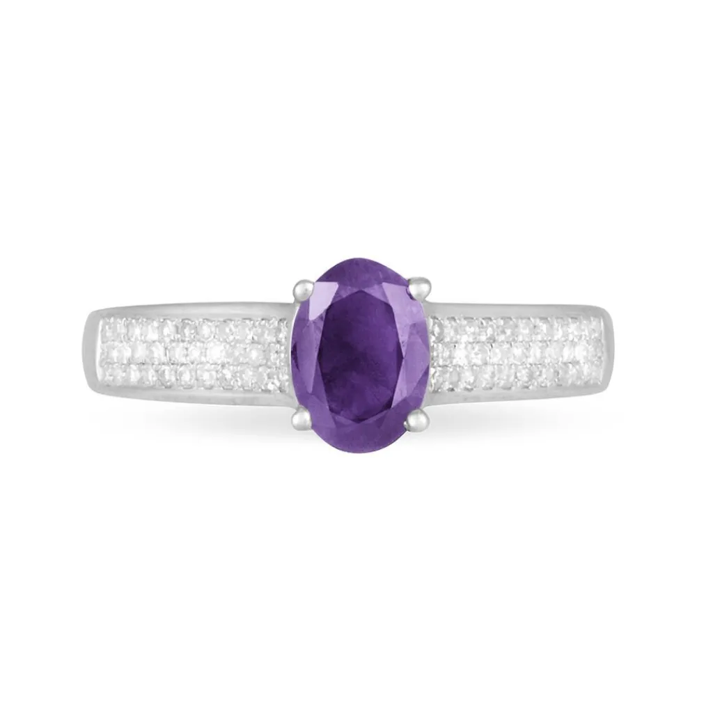 Bague Or Blanc 375/1000 Amethyste Violette Claire Ovale Accompagnee Diamants Mm