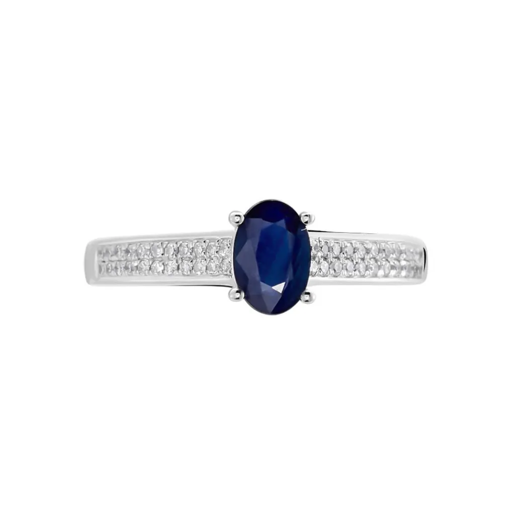 Bague Or Blanc 375/1000 Saphir Ovale Accompagne Diamants Pm