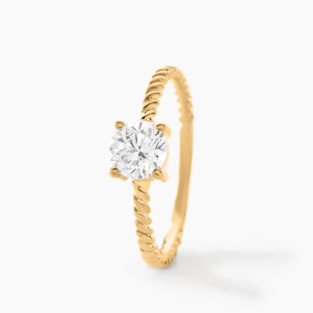 Bague Solitaire Or Jaune 375/1000 Corps De Bague Torsade Oxyde De Zirconium Rond 0.9cts Serti Griffes