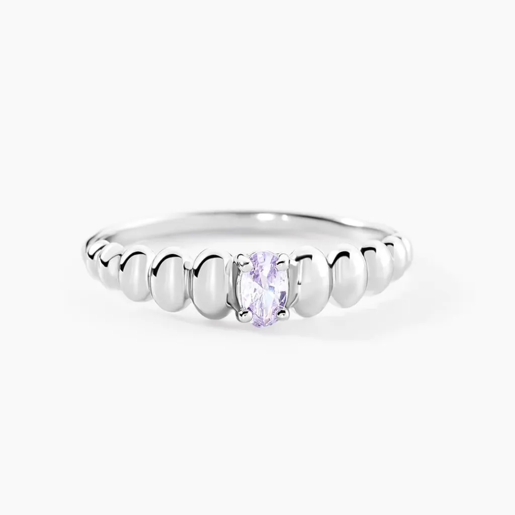Bague Solitaire Argent Blanc 925/1000 Effet Perlé Ovale Oxyde De Zirconium Parme 0,05 Cts Serti Griffes
