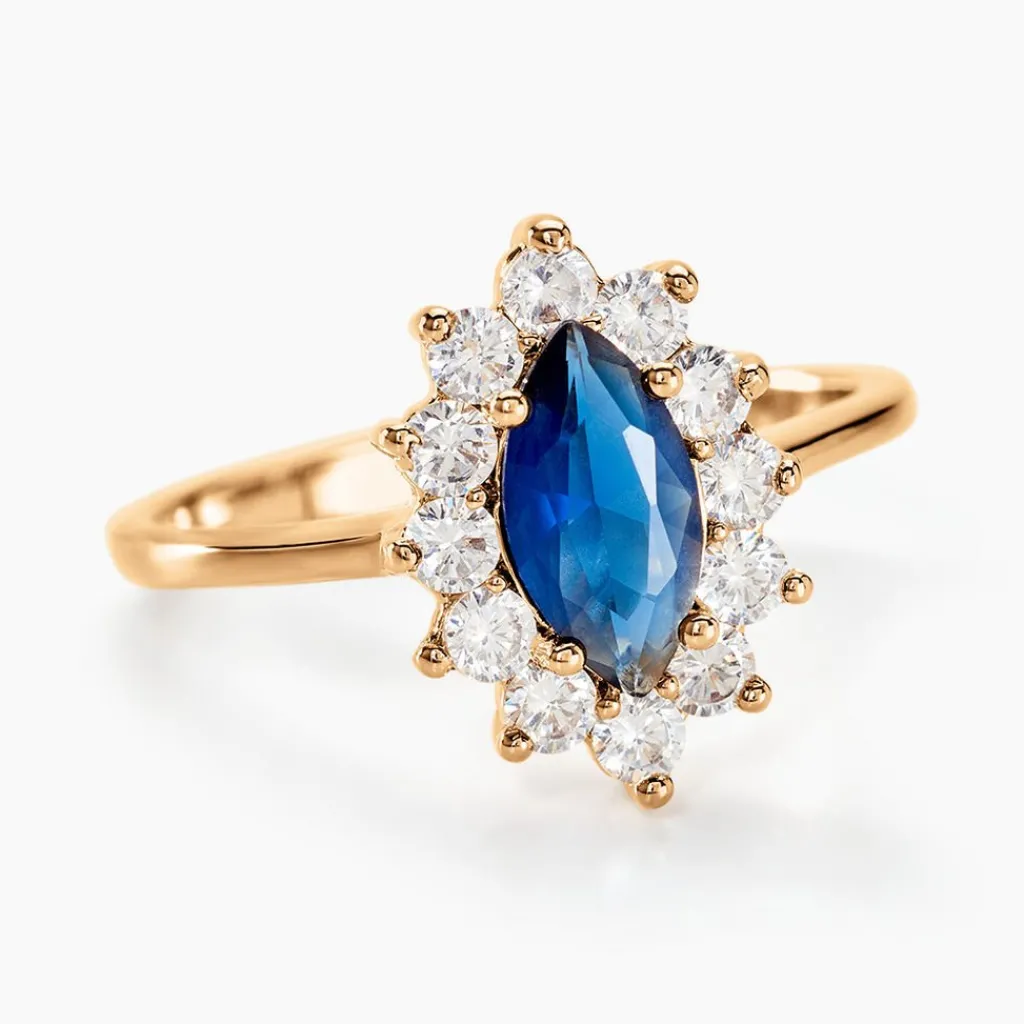 Bague Plaqué Or Jaune Entourage Marguerite Oxydes De Zirconium Pierre Bleue Centrale Forme Navette