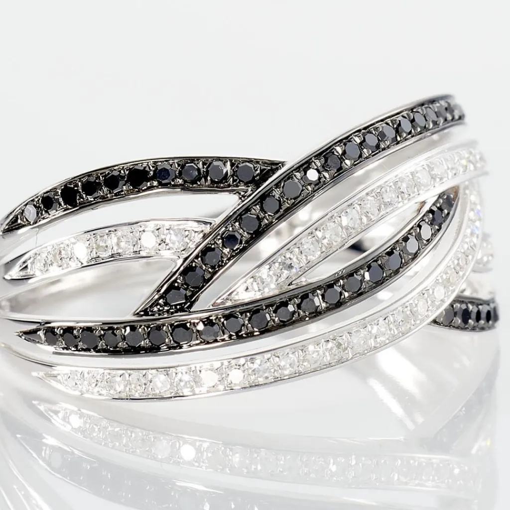 Bague Or Blanc 375/1000 Vagues Croisées Pavage Diamants Blancs Diamants Noirs