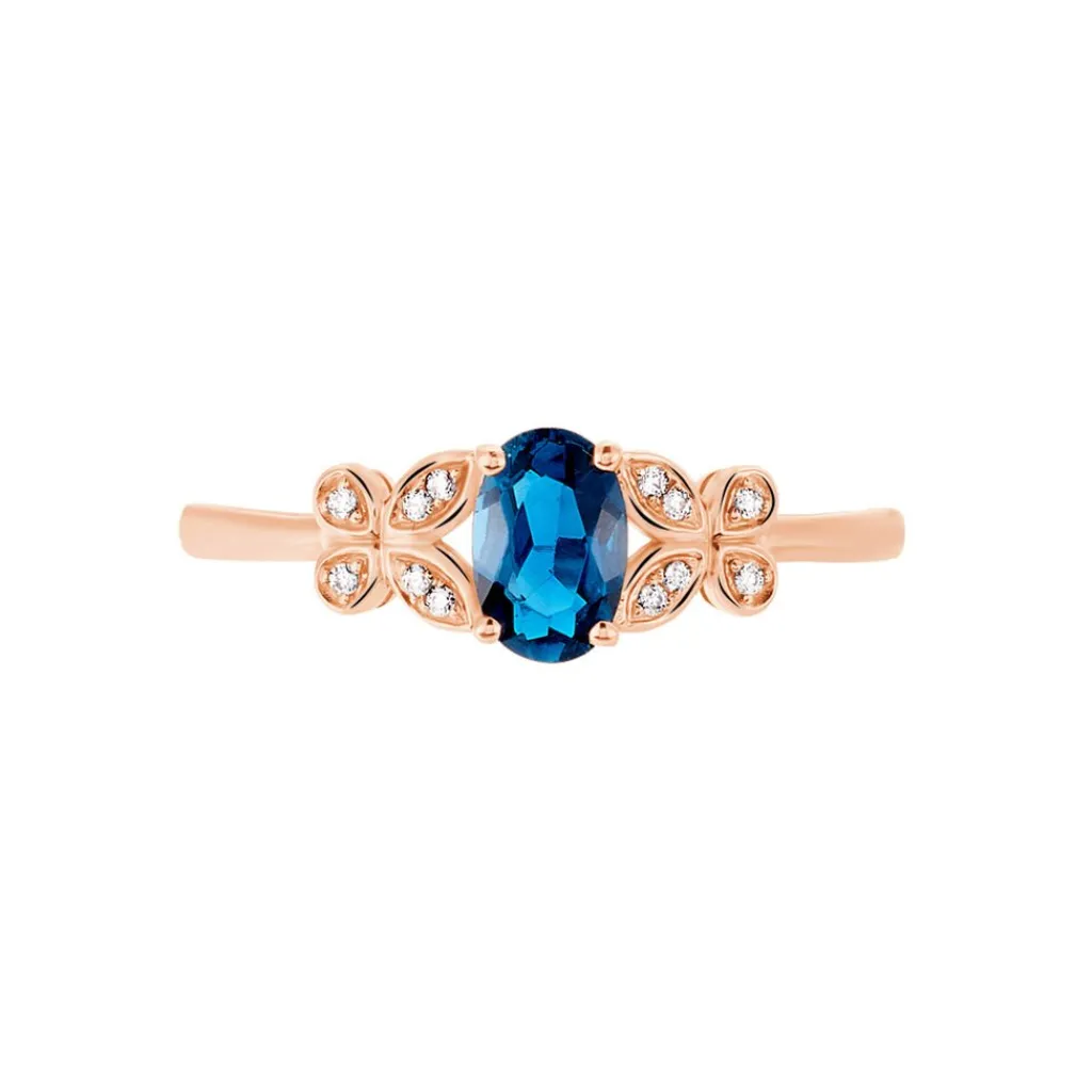 Bague Or Rose 375/1000 Topaze Ovale London Blue Serti Griffes Accompagne Oxydes De Zirconium Style Papillon